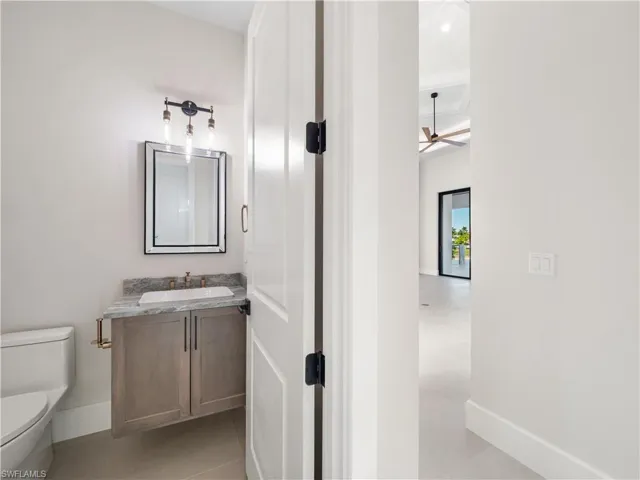 Brand-new construction positioned on deep-water frontage with direct, quick access to the river, this waterfront residence offers a rare opportunity for buyers seeking modern construction paired with true big-boat capability. Located at a quiet cul-de-sac and overlooking the intersection of two canals, the setting provides both privacy and wide, open water views, ideal for serious boaters. Built to the latest building codes, the home features impact-rated doors and windows, a whole-house generator, and a composite dock designed for durability and low maintenance. The thoughtful construction and attention to detail deliver peace of mind alongside elevated coastal design. The interior offers three bedrooms plus a den, three and a half bathrooms, high ceilings, and refined finishes throughout. A spacious three-car garage provides ample storage, while expansive living areas are anchored by a fireplace that adds warmth and architectural interest. Designed for seamless indoor-outdoor living, the exterior spaces are equally impressive. The rear patio features a second fireplace, a fully equipped outdoor kitchen with built-in grill, and a resort-style pool enhanced by custom water features and gas fire bowls that create a striking visual and ambiance day or night. Extensive landscape and architectural lighting further elevate the outdoor experience and highlight the home’s meticulous design. The kitchen is outfitted with premium Thermador appliances, a walk-in pantry, wine cooler, and carefully selected finishes that complement the home’s clean, modern aesthetic. Combining new construction, exceptional boating access, and thoughtfully designed outdoor living, this waterfront home stands apart as a turnkey opportunity for those seeking luxury, location, and lifestyle.