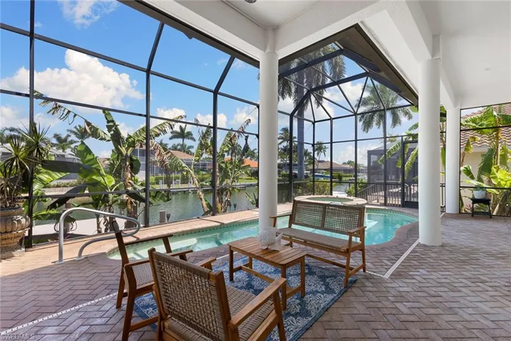 Centrally located in Marco Island lies this exquisite residence. Constructed by Divco Custom Homes in 2005, this dwelling boasts three bedrooms plus a den and three full baths, encompassing a total of 2,588 square feet of air-conditioned living space. The grand wrought-iron entry door is sure to impress. The open-concept floor plan offers volume ceilings and crown molding throughout. The gourmet kitchen is equipped with a walk-in pantry, KitchenAid stainless steel appliances, a breakfast bar and wet bar for entertainment. The primary suite features a walk-in closet, dual vanities, a spa-like shower, and luxurious soaking tub. Your guests will enjoy increased privacy with individual baths and seclusion with a guest wing pocket door. The den is a bonus for those who seek a home office or just extra quiet space. Step outside into your personal tropical sanctuary with screened lanai, paver deck heated pool and spa. Mix tropical smoothies with the fruits in your yard. Leave from your dock to offshore fish for grouper or backwater fish for snook and tarpon in minutes. Catch the sunset every night. If you are looking for your piece of paradise on Marco Island, look no further. This is it!