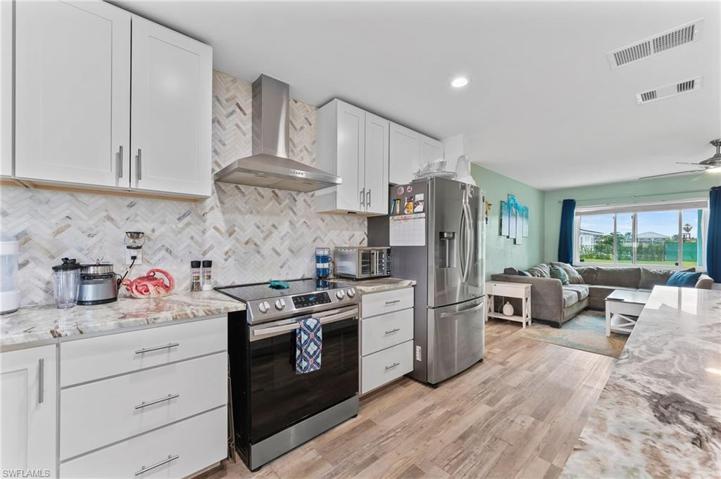 H13381 This home offers unrivaled waterfront living & convenient access to the Gulf of Mexico. Boasting a 40-foot dock with electric & water connections, this residence is a dream come true for boating enthusiasts.Step inside to stunning views from every room. The transformation took place in 2022, including a complete reno of the kitchen that showcases an 8.5′ granite island that seats 5. Step onto the newly installed floors that grace each room, adding a sense of warmth and luxury. The freshly painted walls add a touch of contemporary style. In 2023, the irrigation system was rejuvenated, ensuring lush landscaping year-round. The new AC & water heater, (2017), provides climate control& an abundant hot water supply. The 2019 roof, offers peace of mind & protection from the elements. In 2022, landscaping was revamped, enhancing curb appeal. The fenced yard, with gates on both sides, provides privacy and security. For those seeking the Floridian lifestyle, there is space for a pool, with a retaining wall already in place.This home, on one of Cape Coral’s widest canals, offers a captivating blend of luxurious living, & waterfront beauty.This is a residence where dreams become reality