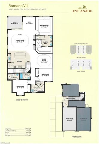 Nestled within the the exclusive confines of Esplanade Golf & CC, discover year round resort style living from this 2nd floor corner residence with Southern views overlooking the lake & golf course. GOLF MEMBERSHIP & OFFERED FURNISHED! Meticulously maintained & ready for new owners, this “Romano VII” coach home offers fabulous open living: 3BD+Den, 3BA, 1-car attached garage, custom millwork finishes, impact doors & windows, spacious laundry room, electric fireplace, tray ceilings, plantations shutters. Modern eat-in kitchen is perfect for entertaining with large granite island, pantry, stainless steel appliances. Private master suite includes walk-in closet & large walk in shower. Main living flows seamlessly onto the outdoor screened lanai for all to relax & enjoy SW Florida weather & the fabulous views! Conveniently located just steps to the Bellano satellite pool. Esplanade resort style amenities are at your fingertips w/ state of the art clubhouse, culinary center, restaurant, bar, 18-hole golf course, resort pool, cabanas, walking trails, 6 tennis courts, dog park, fitness center, pickle-ball, salon, tiki bar, wellness center & much more. Claim your slice in paradise today!