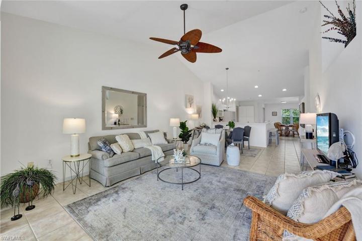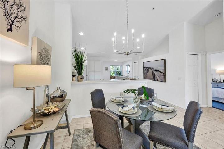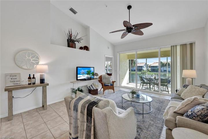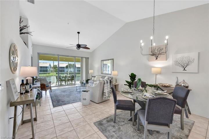 C12353-Light & bright 2nd floor unit with vaulted ceilings in the desirable North Naples gated community of Carlton Lakes. Southern exposure and gorgeous lake views can all be yours. Come see this two bedroom 2 bathroom unit with an open concept floor plan that is great for entertaining family and friends. Enjoy cooking in the large kitchen that opens up to the living/dining area and offers gorgeous views of the lake and fountain from your back lanai. Spacious guest bedroom for guests to relax and unwind at the end of the day. The master suite has an en-suite bath with beautifully updated shower, dual sings & large walk-in closet. This association recently had all new impact windows and sliding glass doors installed as well as freshly painting all buildings and installing new roofs. This unit provides 1 covered parking space and one uncovered guest space. You are walking distance to both the local resident pool as well as the master pool and club house. Amenities include bocce ball courts, tennis courts, tot lot, fishing pier, fitness room, lap pool and spa. Close to shopping, dining & beaches. This unit is also being sold with a 1 year home warranty for the new buyer at closing.