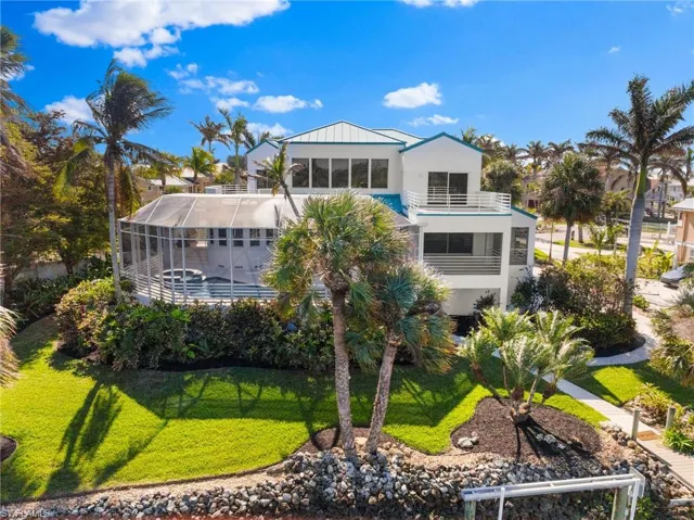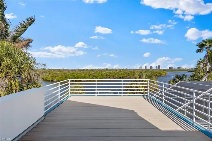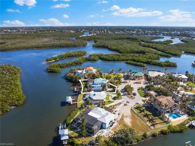Natural and Serene Views from Countless Vantage Points Set on a Peninsula. Enjoy 130’ of bay front shoreline, direct gulf access, Doc’s Beach house and the powdery white sands of Barefoot Beach. This captivating Art Deco inspired modern architecture home includes 4527 Square feet under air! The open floor plan features a huge kitchen with Sub-Zero and Bosch appliances that opens up to its 2 story great room with panoramic views of the bay. After a day at the beach spend afternoons in the elevated 1250 sqft lanai with its amazing pool and spa. Two 3rd floor Balconies perched over Fish Trap Bay and its many islands offer Infinite views of diverse waters, mangrove islands and ocean sunsets. The dual slip boat dock provides another opportunity for relaxation and access to fishing. Additionally, this home has an elevator, home office, craft room, and an oversized .35 acre lot with lush tropical landscaping. Buyers looking to own their piece of paradise with direct gulf/ beach access, privacy on a col du sac will find this stunning property a great place to call home. This property is an investors dream whether you’re looking to generate revenue via lease or give the home a modern facelift.