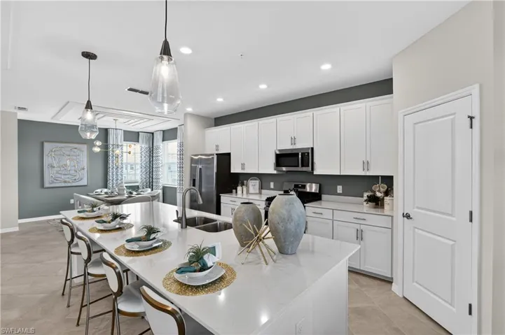 THIS COACH HOME IS READY FOR YOU NOW!! Willowgreen at Babcock Ranch is moments from bustling Founder’s Square and Lake Babcock, offering an elegant selection of coach homes which exude warmth and charm. Step inside this expansive 2,110-square-foot attached home, the largest in the Willowgreen at Babcock Ranch collection. The first floor is anchored by an impressive two-car garage with hurricane-rated door and keyless entry for added security. Upstairs, bright and open living spaces are designed for effortless entertaining, with a sleek kitchen that features quartz countertops, a spacious island and a full suite of brand-new stainless steel appliances—including a gas range, built-in microwave and French door refrigerator. Sliding doors lead to your private, screened patio retreat, perfect for gatherings or quiet nights outdoors. All three bedrooms, including the luxurious owner’s suite with a spa-inspired bath, are thoughtfully placed on this level, offering oversized walk-in closets and modern finishes throughout. Every detail, from ceramic tile flooring and LED recessed lighting to a Ring Video Doorbell Pro and a Honeywell Home T6 Pro Wifi smart thermostat, is crafted for comfort and convenience. Designer cabinetry, EPA WaterSense® fixtures and hurricane-impact windows add both style and peace of mind. Homes like this—with premium features, energy efficiency and a prime location moments from Founder’s Square—won’t last long. Prices, dimensions and features may vary and are subject to change. Photos are for illustrative purposes only.