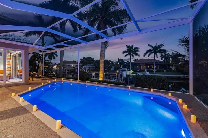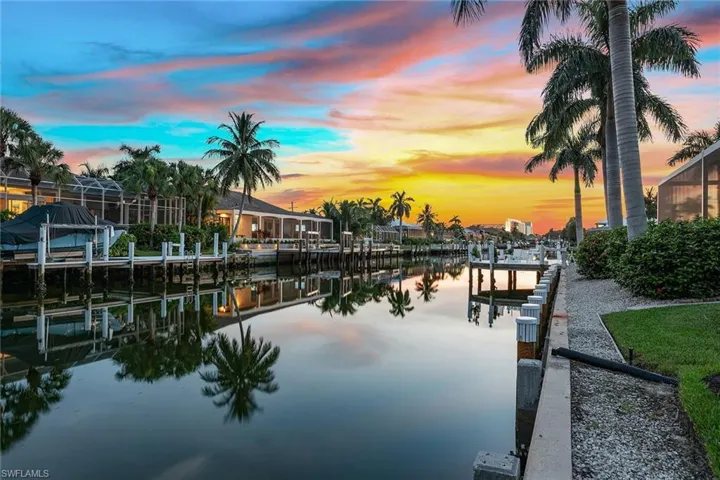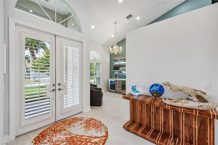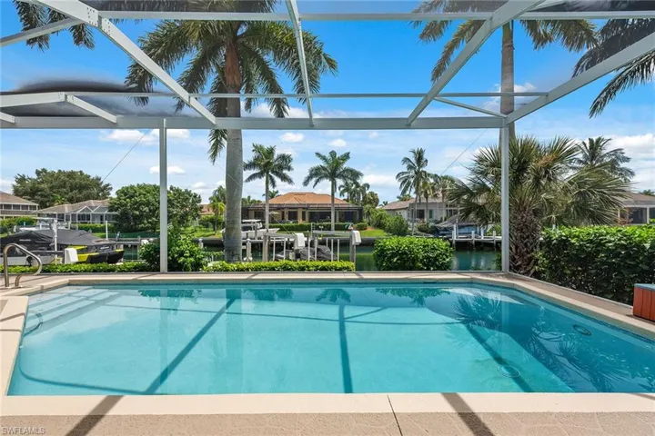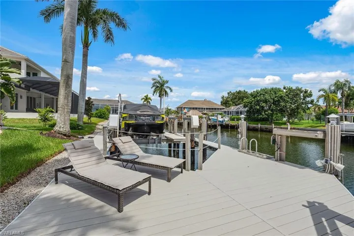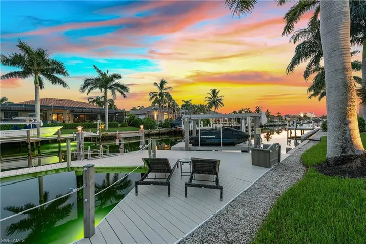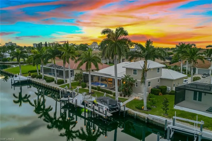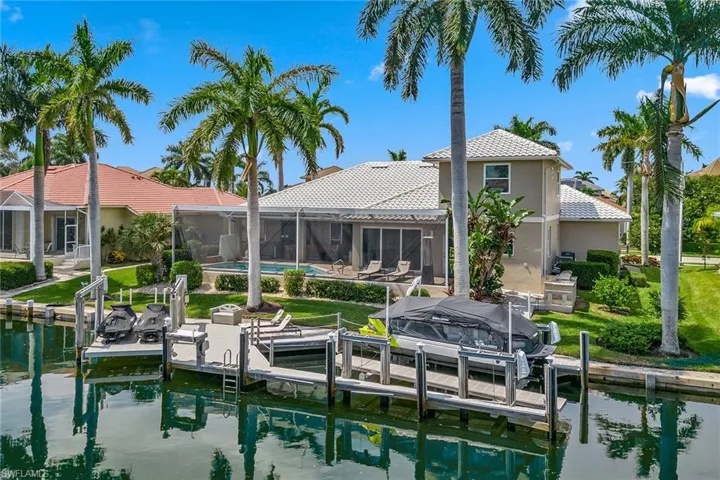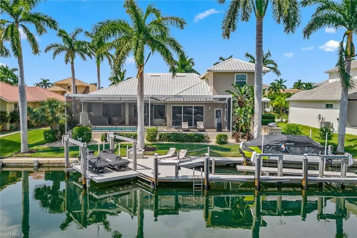 Experience luxury waterfront living in this turnkey furnished home with 100 feet of serene canal frontage. It is a boater’s paradise with a private boat dock, dual jet ski lift and quick gulf access! Spanning 2,795 square feet, this beautifully renovated two-story residence, updated in 2023, includes four bedrooms, a den, three full baths and a three-car garage. Sunlight floods the home throughout the day, with the pool basking in sunlight year-round thanks to its southern exposure. Upon entering, you’re greeted by new flooring, soaring volume ceilings and designer lighting. The open living spaces are ideal for entertaining, with tile flooring in the main areas and hardwood in the bedrooms, all complemented by white plantation shutters. The modern kitchen is a chef’s dream, featuring white upgraded cabinetry, quartz countertops, a mosaic tile backsplash and newer top-of-the-line GE Café stainless steel appliances, all with extended warranties, including a Bosch refrigerator, dual conventional/microwave oven, and built-in cool touch cooktop. Adjacent is a full wet bar with custom shelving, a wine cooler and an under-counter ice maker, ideal for hosting. The spacious owner’s suite features tray ceilings, crown molding and a luxurious en-suite bath with dual quartz vanities, Halo LED mirrors, a walk-in shower with floor-to-ceiling tile and a free-standing tub. The suite also includes a large walk-in closet with a custom California Closet system. One guest bedroom offers lanai access and an en-suite bath that doubles as a pool bath, while two upstairs guest rooms share a full bath. The den/study, with a double door entry and an arched window, provides a quiet space for work or relaxation. The expansive screened lanai, featuring a new screen enclosure, offers covered and uncovered areas, ideal for outdoor living. The heated pool, featuring a chiller, has been newly resurfaced with updated tile work and refreshed decking and is complemented by a separate saltwater spa. The outdoor area also includes a top-notch built-in TEC infrared grill, outdoor shower and ample seating to enjoy tranquil water views. This home is equipped with impact-resistant windows and doors, and electric storm shutters, updated electrical and PEX plumbing systems, a whole-home dehumidification system, a whole-home carbon water filter, a Sonos audio system throughout, a Generac generator, remotely tested/maintained weekly, a buried 500-gallon propane tank and newer 2018 tile roof. Additional features include new lift motors and controllers for the boat and jet ski lifts, plus a negotiable Jeep Wrangler. Kayaks, jet skis, eight bicycles, two paddle boards, and all tools and fishing equipment are included. Ideally in the southwest quadrant of Marco Island, this home is a short distance to the beach entrance and vibrant shops, theater and restaurants of Marco Walk Square, with easy access to additional gourmet dining, shopping and golf courses by bicycle or car.