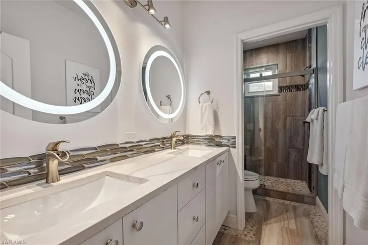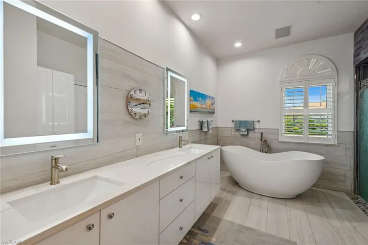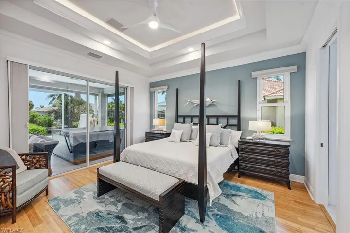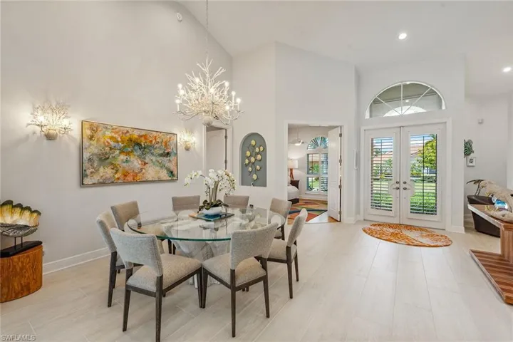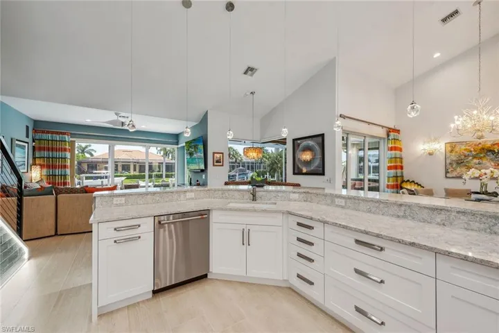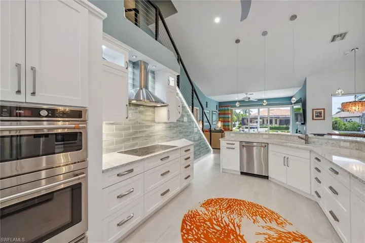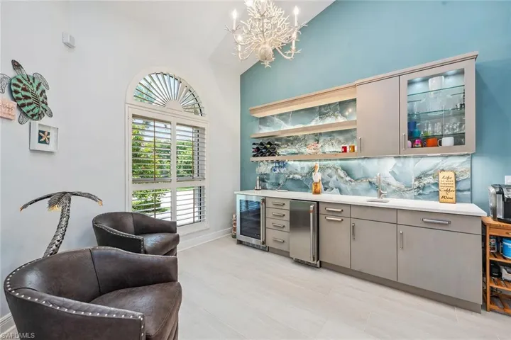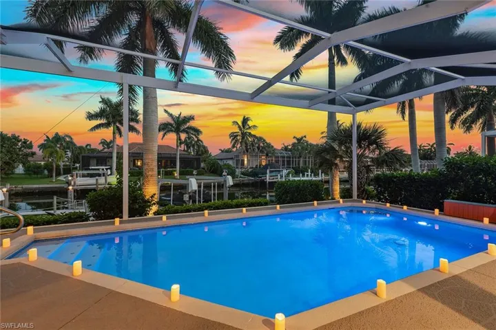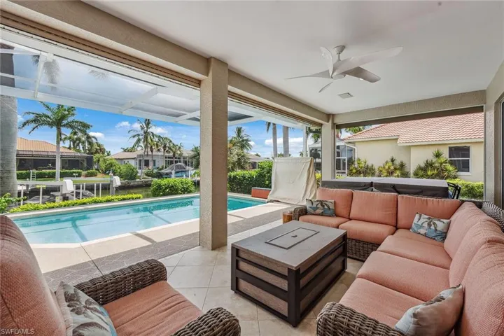 Experience luxury waterfront living in this turnkey furnished home with 100 feet of serene canal frontage. It is a boater’s paradise with a private boat dock, dual jet ski lift and quick gulf access! Spanning 2,795 square feet, this beautifully renovated two-story residence, updated in 2023, includes four bedrooms, a den, three full baths and a three-car garage. Sunlight floods the home throughout the day, with the pool basking in sunlight year-round thanks to its southern exposure. Upon entering, you’re greeted by new flooring, soaring volume ceilings and designer lighting. The open living spaces are ideal for entertaining, with tile flooring in the main areas and hardwood in the bedrooms, all complemented by white plantation shutters. The modern kitchen is a chef’s dream, featuring white upgraded cabinetry, quartz countertops, a mosaic tile backsplash and newer top-of-the-line GE Café stainless steel appliances, all with extended warranties, including a Bosch refrigerator, dual conventional/microwave oven, and built-in cool touch cooktop. Adjacent is a full wet bar with custom shelving, a wine cooler and an under-counter ice maker, ideal for hosting. The spacious owner’s suite features tray ceilings, crown molding and a luxurious en-suite bath with dual quartz vanities, Halo LED mirrors, a walk-in shower with floor-to-ceiling tile and a free-standing tub. The suite also includes a large walk-in closet with a custom California Closet system. One guest bedroom offers lanai access and an en-suite bath that doubles as a pool bath, while two upstairs guest rooms share a full bath. The den/study, with a double door entry and an arched window, provides a quiet space for work or relaxation. The expansive screened lanai, featuring a new screen enclosure, offers covered and uncovered areas, ideal for outdoor living. The heated pool, featuring a chiller, has been newly resurfaced with updated tile work and refreshed decking and is complemented by a separate saltwater spa. The outdoor area also includes a top-notch built-in TEC infrared grill, outdoor shower and ample seating to enjoy tranquil water views. This home is equipped with impact-resistant windows and doors, and electric storm shutters, updated electrical and PEX plumbing systems, a whole-home dehumidification system, a whole-home carbon water filter, a Sonos audio system throughout, a Generac generator, remotely tested/maintained weekly, a buried 500-gallon propane tank and newer 2018 tile roof. Additional features include new lift motors and controllers for the boat and jet ski lifts, plus a negotiable Jeep Wrangler. Kayaks, jet skis, eight bicycles, two paddle boards, and all tools and fishing equipment are included. Ideally in the southwest quadrant of Marco Island, this home is a short distance to the beach entrance and vibrant shops, theater and restaurants of Marco Walk Square, with easy access to additional gourmet dining, shopping and golf courses by bicycle or car.