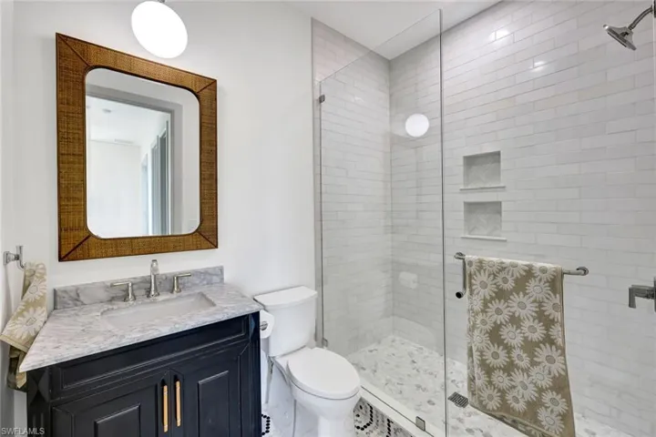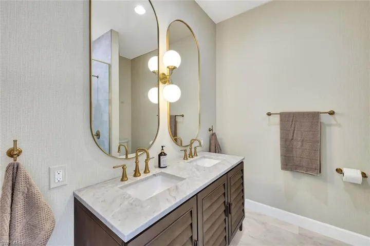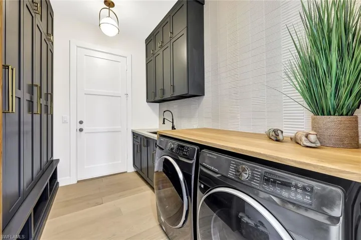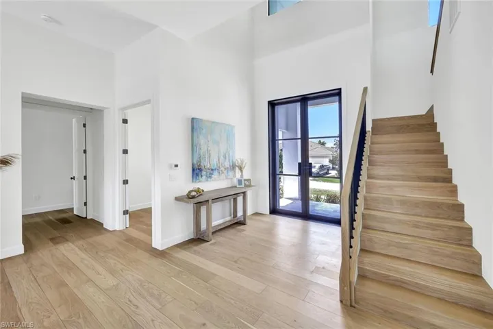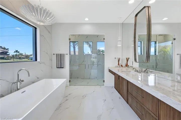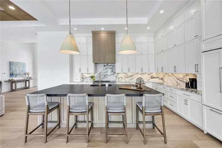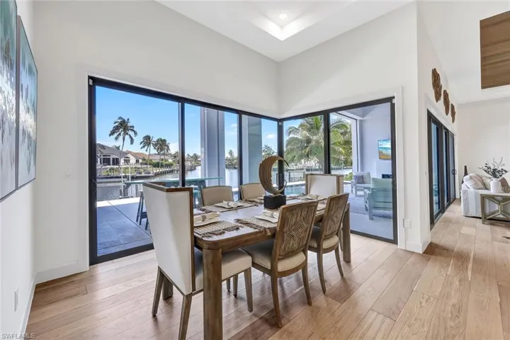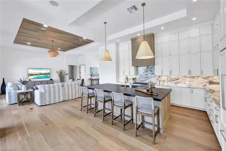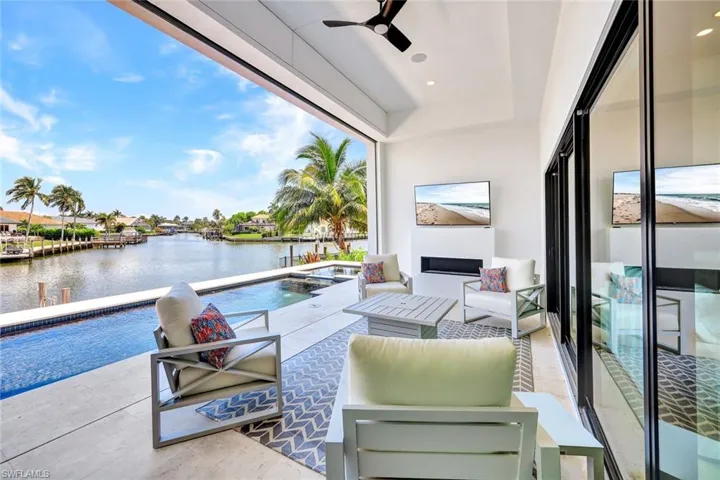 Brand New Build with Captivating Water Views Awaits! Step into an upscale coastal contemporary lifestyle with this stunning 2-story home boasting 4 Beds, 5 Baths and 5559SF TTL. Expansive water vistas take in converging waterways throughout the residence.The open-plan living area welcomes you with soaring ceilings adorned with 12-foot tongue and groove wood lining, accentuated by an abundance of sliders that invite natural light. Refined elegance with sophisticated fixtures, designer lighting and luxurious finishes along with exceptional architectural details define modern sophistication. With meticulous attention to detail, this home boasts wide wood plank flooring, Quartz and stone counters, bespoke tile work, and designer wall finishes. The gourmet kitchen with pristine white oak drawers and cabinets, an expansive gas cooktop/range, and a spacious island includes a breakfast bar and wine fridge. A stylish walk-in butler’s pantry, features a wet bar with refrigerator which adds an extra layer of convenience for entertaining. The ultimate outdoor oasis is complete with a covered summer kitchen and dining area boasting a built-in grill, ice machine, and fridge, accompanied by a cozy gas fireplace in the living area for al fresco lounging and dining under the stars. Electric drop-down screens and hurricane shutters, along with impact glass throughout, ensure both comfort and security. Retreat to the sumptuous ground floor primary suite, where panoramic water views await and Indulge in luxury with dual custom-built walk-in closets and a spa-like marble-lined bath featuring a large free-standing tub, zero-entry shower with bench, dual sinks and designer lighting. Upstairs, three generously proportioned ensuite bedrooms await, each offering its own unique charm and character. Gather in the shared living space with wet bar, or step out onto the open terraces to revel in the scenic waterfront. Outside, the southeast-facing open water rear views flood the home with natural light, while the Travertine pool decking leads the way to the zero-edge shallow beach pool and spa with pool bath. The fenced yard, complete with a lush lawn, extends to the dock with lift and newer (2020) seawall, perfect for water direct (no bridges), boating to the Gulf. Additional features include two separately zoned A/C systems, comprehensive home security features for added peace of mind and a 3 car garage. Paradise awaits in this contemporary coastal NEW BUILD masterpiece, offering a new chapter in luxurious Florida living.