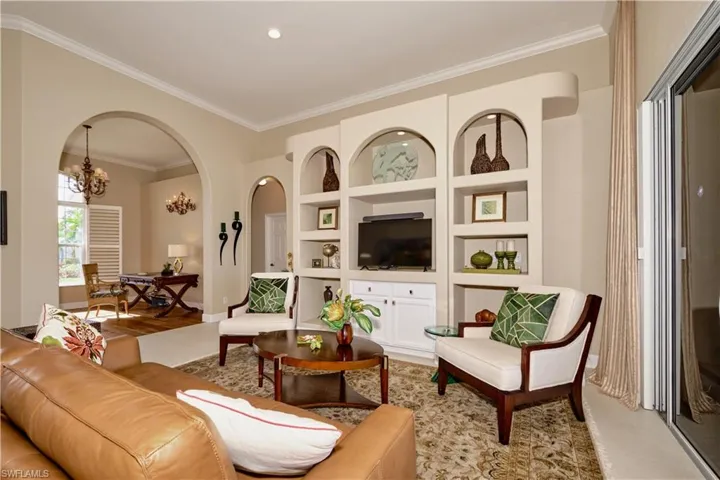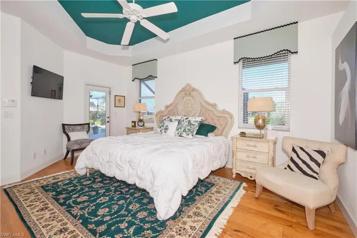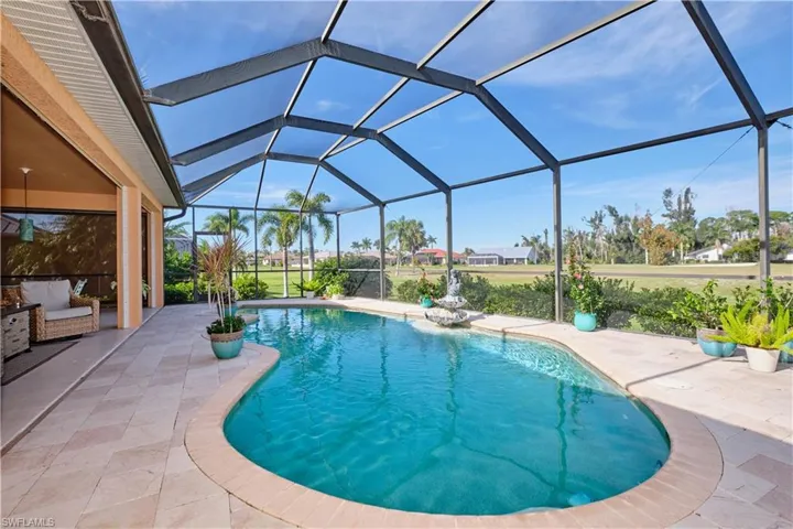 This home is a must see! Light streams from vaulted ceilings with deep crown molding, recessed lights, accent lighting, chandeliers & dimmers. The kitchen with granite, large pantry, new 2023 dishwasher, and quality appliances will satisfy any chef. A den has wood floors and this room can be also enjoyed as an office or even a bourbon & cigar room! The front bedroom is perfect for an art studio with light from the bay window. The rear bedroom is a retreat with tumbled marble tile, closet system, & fresh paint. The remodeled hall bath has a spacious shower, heavy glass enclosure, & a quartz counter. On the other side, French doors lead to a private master bedroom with tray ceiling & wood floors. The master bathroom has a spacious shower with rain head, heavy glass enclosure, soaking tub, & a closet system. The great room’s telescoping doors lead to a 40′ pool, colorful underwater lighting, and marble pavers. You may protect the lanai by lowering the motorized Kevlar hurricane screens. The view from the lanai is a nature lover’s dream. The lake has otters, turtles, wood storks, egrets, ducks, seagulls, eagles, & even an owl! Updates include new tile roof in 2022, spray foam insulation which means lower utility bills, & a new hot water heater in 2023. Join the Cape Royal lifestyle by living in a financially strong gated community, with really fun-loving neighbors, who enjoy many social activities and events.