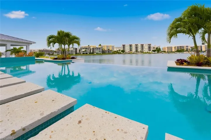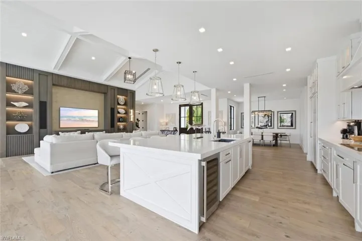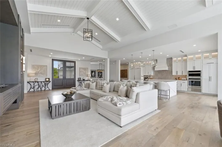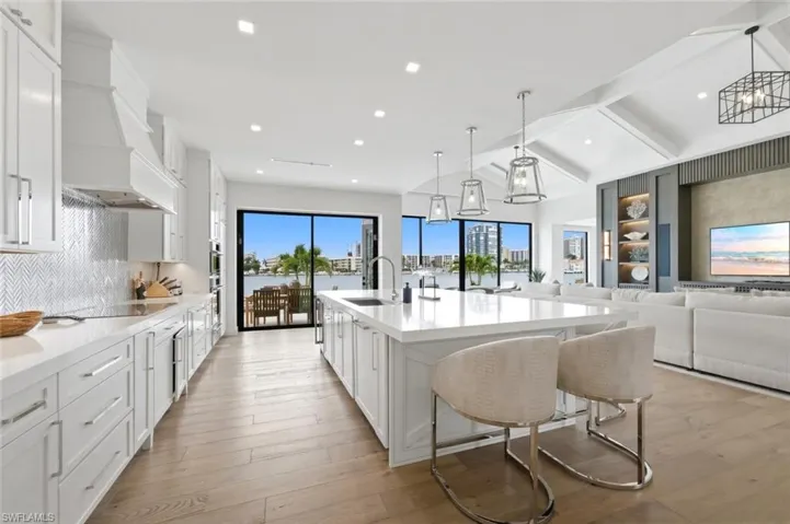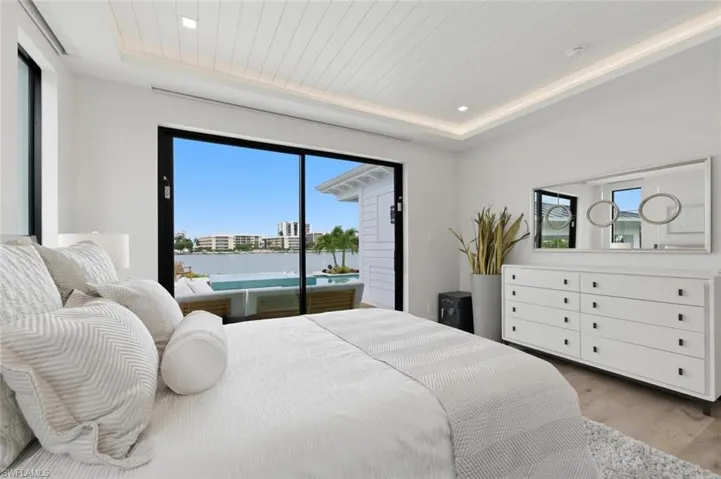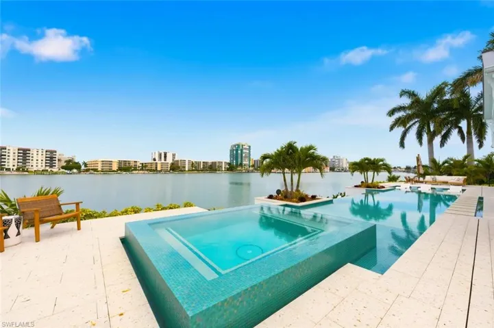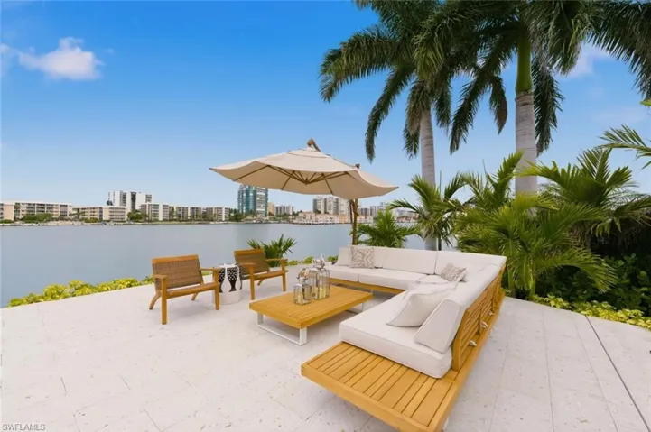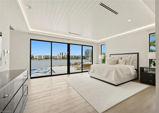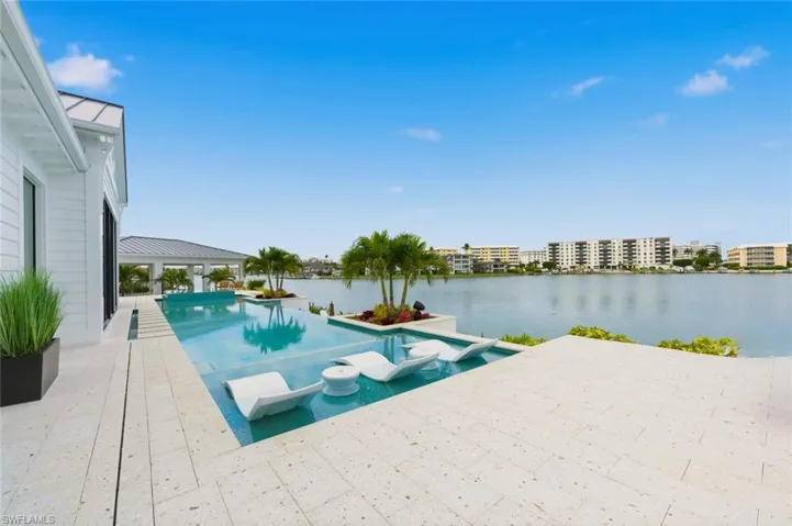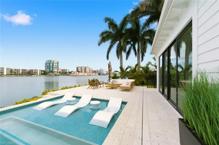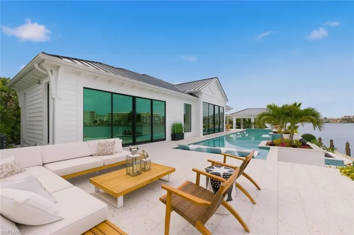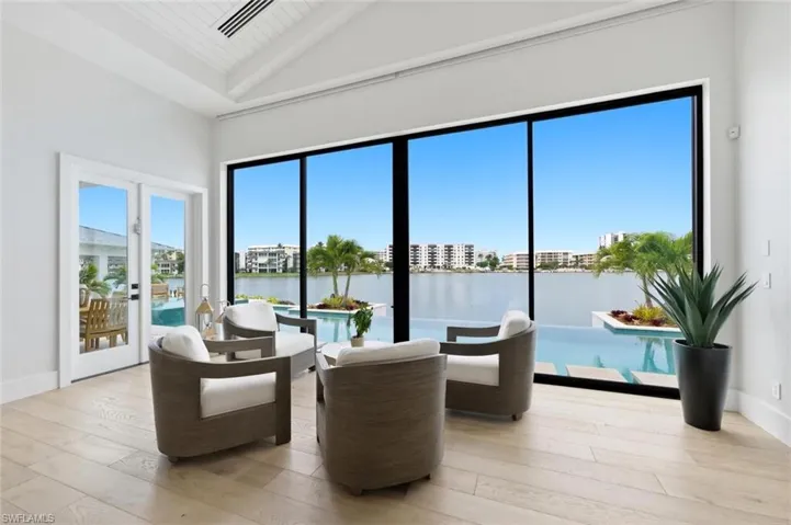 Perfectly positioned at the tip of a quiet cul-de-sac, this exceptional waterfront residence captures sweeping views of Moorings Bay from Harbour Bridge to the south to Venetian Village to the north. Fully renovated and impeccably designed, this 5 bedroom, 4 bath home defines modern luxury living. The main living area is both sophisticated and inviting, featuring a spacious sectional, custom entertainment wall, soaring vaulted ceilings, rich wood flooring, and a serene sitting area that frames the sparkling bay views. Designed to impress, the chef’s kitchen showcases top-tier finishes, including an expansive island with seating for seven, an oversized refrigerator, wine cooler, and sleek white cabinetry. The open-concept layout flows effortlessly into the elegant dining area, highlighted by statement lighting and seating for eight—perfect for entertaining. The primary suite is a true retreat, offering a king-sized bed and a wall of windows overlooking the water. The spa-inspired primary bath features dual vanities, a soaking tub, an oversized walk-in shower, and a custom walk-in closet. Three beautifully appointed guest bedrooms, each with queen-sized beds, provide comfort and privacy for family and guests. A fifth bedroom currently serves as a stylish den with dual workspaces and a cozy seating area, with the option to convert it into a bedroom upon request. Just outside is your private waterfront oasis, boasting 170 feet of frontage, a resort-style pool, boathouse, gas fireplace, and lush tropical landscaping with swaying palms—an ideal setting for relaxation or entertaining. Residents also enjoy eligibility for membership to the exclusive Moorings Beach Park. This remarkable home offers a rare opportunity to experience the very best of Naples waterfront living. Live exceptionally in The Moorings.