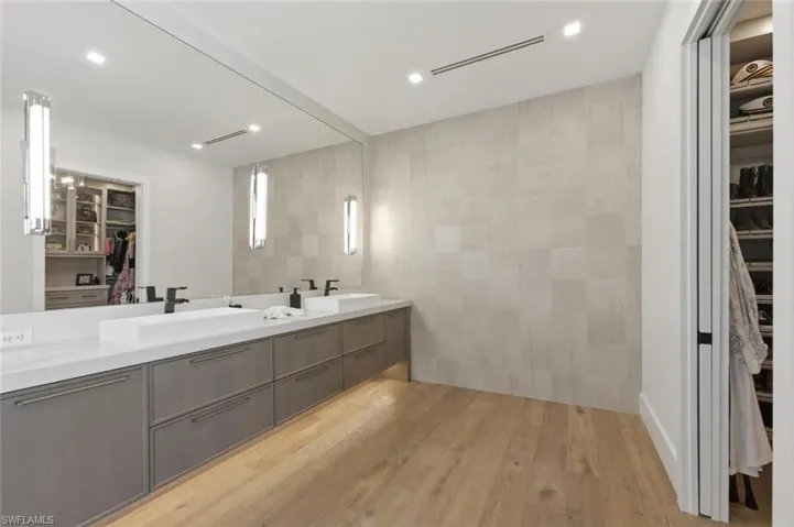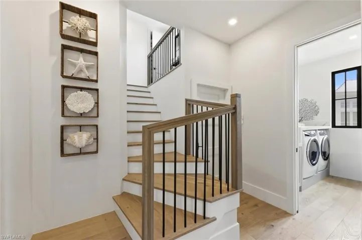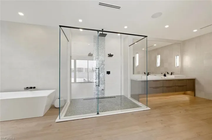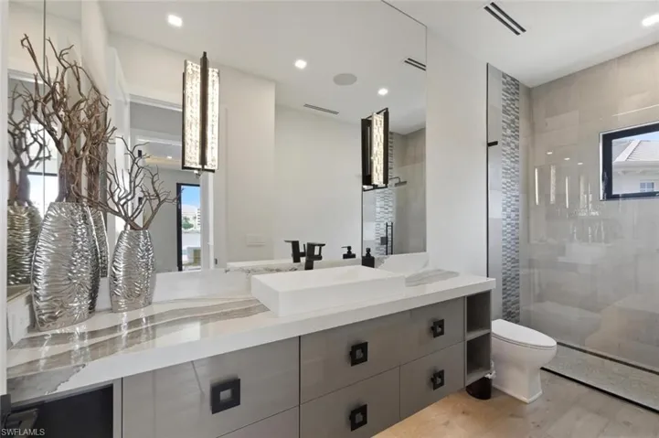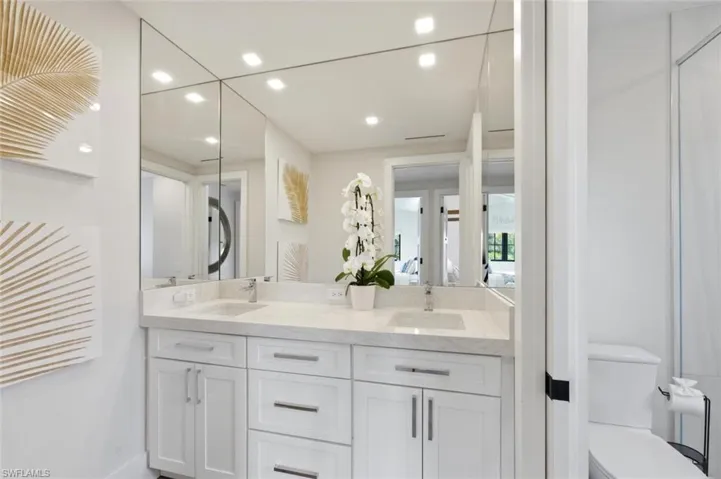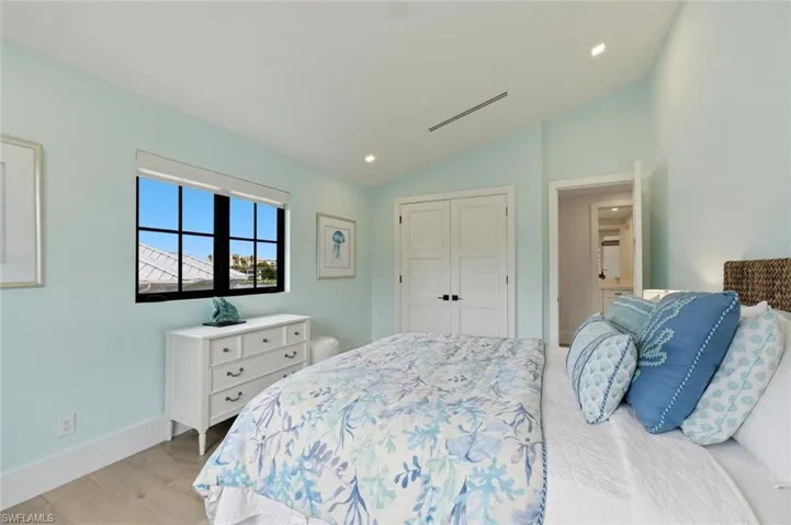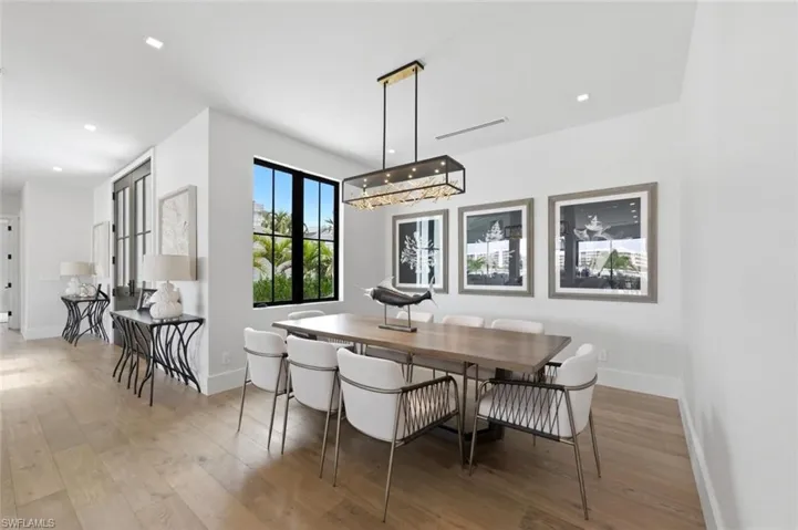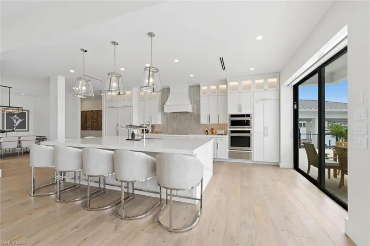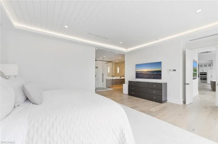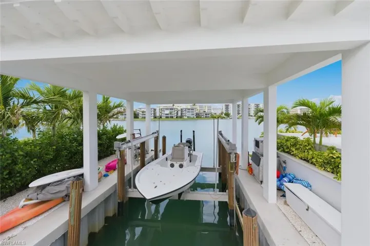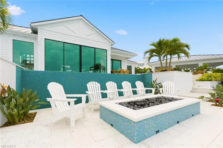Perfectly positioned at the tip of a quiet cul-de-sac, this exceptional waterfront residence captures sweeping views of Moorings Bay from Harbour Bridge to the south to Venetian Village to the north. Fully renovated and impeccably designed, this 5 bedroom, 4 bath home defines modern luxury living. The main living area is both sophisticated and inviting, featuring a spacious sectional, custom entertainment wall, soaring vaulted ceilings, rich wood flooring, and a serene sitting area that frames the sparkling bay views. Designed to impress, the chef’s kitchen showcases top-tier finishes, including an expansive island with seating for seven, an oversized refrigerator, wine cooler, and sleek white cabinetry. The open-concept layout flows effortlessly into the elegant dining area, highlighted by statement lighting and seating for eight—perfect for entertaining. The primary suite is a true retreat, offering a king-sized bed and a wall of windows overlooking the water. The spa-inspired primary bath features dual vanities, a soaking tub, an oversized walk-in shower, and a custom walk-in closet. Three beautifully appointed guest bedrooms, each with queen-sized beds, provide comfort and privacy for family and guests. A fifth bedroom currently serves as a stylish den with dual workspaces and a cozy seating area, with the option to convert it into a bedroom upon request. Just outside is your private waterfront oasis, boasting 170 feet of frontage, a resort-style pool, boathouse, gas fireplace, and lush tropical landscaping with swaying palms—an ideal setting for relaxation or entertaining. Residents also enjoy eligibility for membership to the exclusive Moorings Beach Park. This remarkable home offers a rare opportunity to experience the very best of Naples waterfront living. Live exceptionally in The Moorings.
