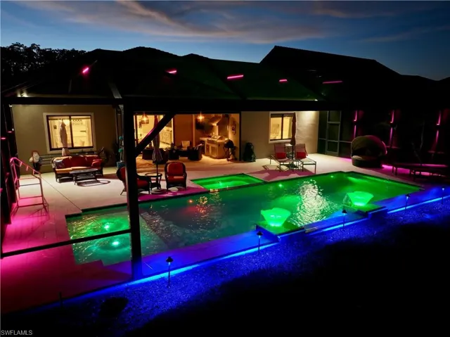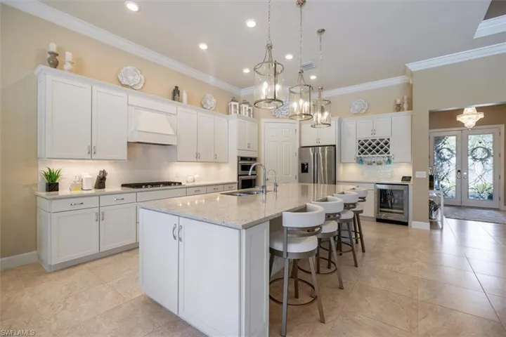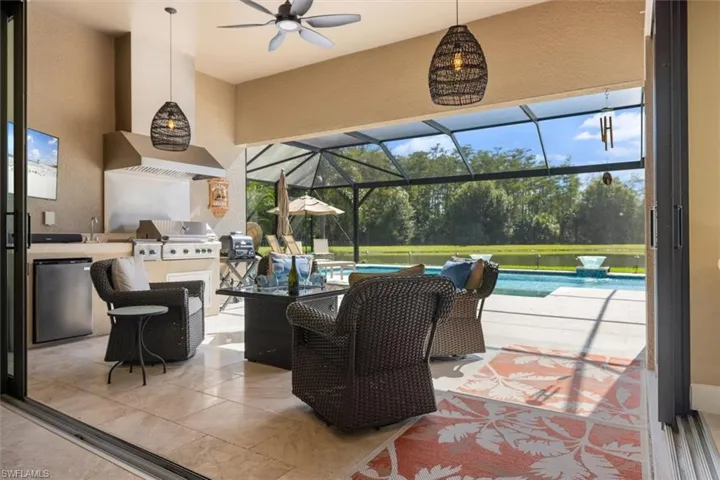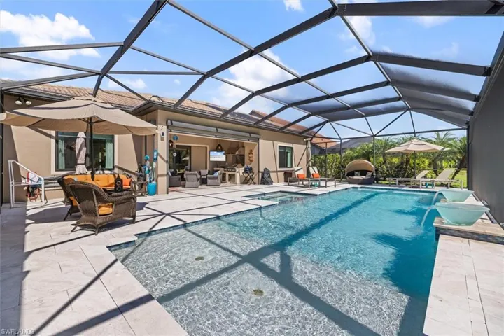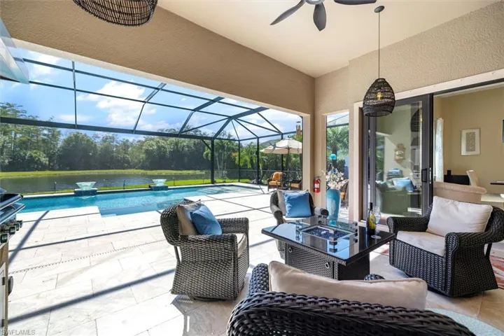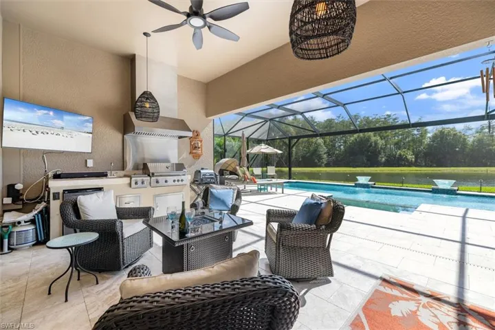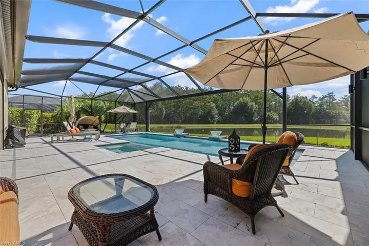 PRIVACY-TRANQUILTY-LAKEFRONT-POOL-SPA= EVERYTHING YOU WANT HERE IN PARADISE! Live like you’re on vacation year-round in the luxury resort style gated community of CORKSCREW SHORES in Estero SW Florida. Entertaining backyard OASIS featuring a ‘picture window’ screened lanai with unobstructed views of the shimmering lake with woods in the rear & wildlife (no neighbors behind you). Heated saltwater custom pool with cascading water bowl features & custom outdoor lighting for ambiance. Pinnacle floor plan by PULTE Homes with over $350k in upgrades. 2488 sq ft, total of 3149 sq ft indoor/outdoor entertaining space where the zero edge sliding glass doors open to the outdoor kitchen & covered patio. Gourmet white kitchen with GAS stove, oversized quartz island with seating, walk in pantry & formal dining area. 3 bedrooms, den/office, 3 full baths & extended 3 car AIR-CONDITIONED garage. Feel protected with IMPACT windows + Electric hurricane shutters + GENERATOR.