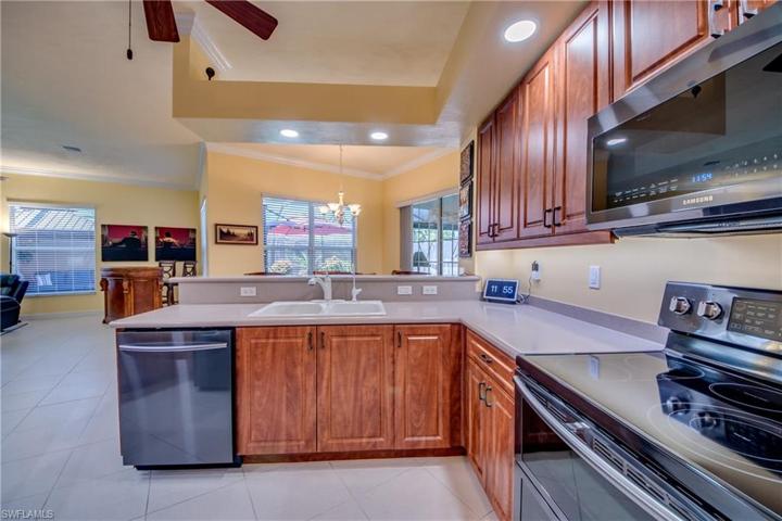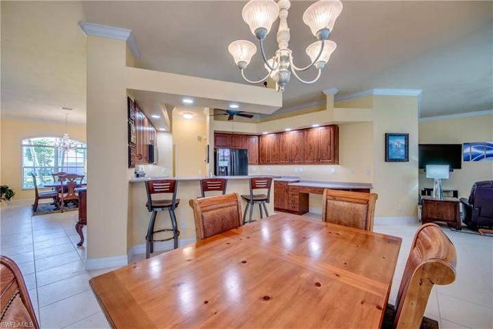 Welcome to one of the most highly, sought after neighborhoods in the Southwest Cape. Experience the spaciousness this FULLY FURNISHED home has to offer with 10′ ceilings, 2 primary suites, a 3rd bedroom, 3rd guest bath, family room, formal dining room, living room and a den/home office space. Home was built by Tracey Construction and is rated by LCEC as an Energy Efficent Home qualifying under the Good Cents Home Program. Boasting one of the largest backyard oasis there is a large, wi-fi controlled, salt water pool heated with electric or solar, wi-fi controlled 6 person built in spa, water features, living areas and a large metal gazebo. Owner’s suite has a walk-in closet, large jetted soaking tub, tiled walk-in shower, dual sinks and a slider to the lanai. Yard is meticulously maintained and boasts some of the greenest grass in the area. Upgrades include crown moulding, 10′ ceilings, 8′ front doors, whole house Kinetico water system with reverse osmosis drinking water station, epoxy garage floor, garage custom shelving, black stainless steel appliances, fenced area to shelter pool equipment on one side and water system equipment and garbage cans on the other side. Gazebo 2020, A/C 2018, Water heater 2020 and Pool/Spa 2014. New in 2023/2024: flat tile roof, insulated hurricane rated garage door with quiet drive belt opener, gutters, entire pool rescreened, exterior paint and exterior LED lighting.