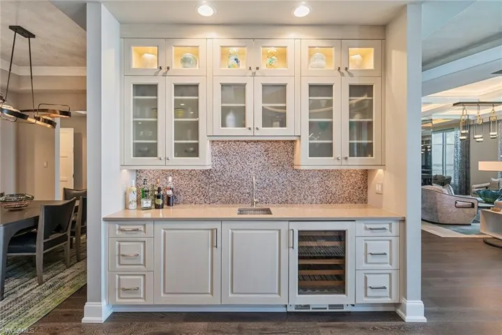 This iconic residence crowns the 23rd floor of Seaglass at Bonita Bay, where two units have been masterfully combined into a singular, 6,000-plus-square-foot designer showcase with expansive outdoor living. Every inch reflects opulence and visionary artistry by the renowned Collins & DuPont team, earning its feature in Florida Design Magazine for elevated, livable design. Framed by uninterrupted Gulf and Bay views through soaring floor-to-ceiling windows, the condominium offers a sensation of floating above it all like a bird in flight. Western-facing balconies offer retractable screens and hurricane shutters, creating year-round comfort and protection while delivering front-row seats to the Gulf’s ever-changing canvas and majestic sunsets. The great room flows effortlessly into multiple living and entertainment spaces: a piano nook, lounge area, pool table zone and dining—all anchored by a gourmet kitchen that would make any chef swoon. Rich wood tones contrast against crisp quartz countertops, a sprawling center island, and cabinetry that feels more like bespoke furniture. Even the view from the sink is striking. In the dining area, a custom wet bar elevates entertaining, while LED-lit radius ceilings add sculptural drama throughout. Even the powder room and laundry room shimmer with designer touches. The primary suite offers a serene, Gulf-facing retreat with a spa-style bath, oversized glass-enclosed shower, double vanities, and a boutique-style walk-in closet with multiple quartz islands. Two en-suite guest bedrooms on the east wing offer luxury and privacy for family and visitors. Two separate office spaces provide flexibility for remote work, hobbies, or can be easily converted into additional guest suites. A dedicated den offers an immersive cinematic experience. A private, air conditioned two-car garage and two additional parking spaces complete this rare offering. Your masterpiece in the sky awaits.