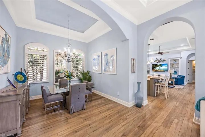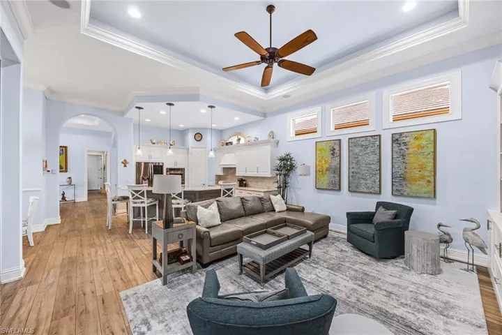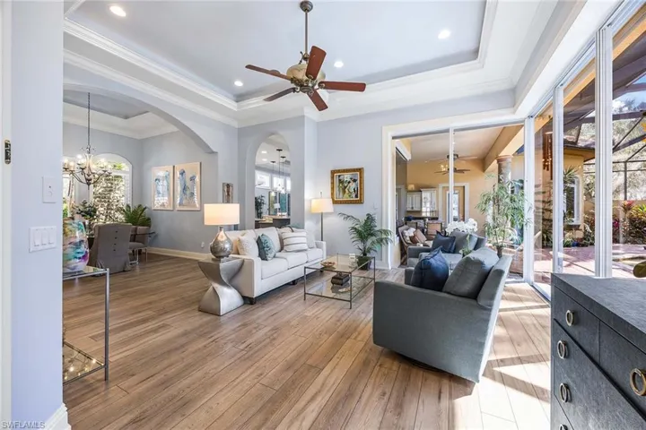 In the double-gated Majors enclave of Lely Resort, this meticulously maintained furnished Monterey model courtyard residence offers privacy, thoughtful upgrades and a flexible layout designed for entertaining. On a lushly landscaped homesite, the courtyard floor plan includes a detached cabana guest suite with a private entrance and kitchenette, providing comfortable accommodations for extended stays or multigenerational living. Interior features include 12-foot ceilings, crown molding, tray ceilings and luxury laminate plank flooring throughout. Custom plantation shutters and updated ceiling fixtures enhance the home’s refined presentation. A dedicated den features a custom-built cabinet system, offering integrated storage and workspace functionality. This versatile room is well-suited as a private home office, library or media room. The renovated kitchen showcases white and gray cabinetry, granite countertops, upgraded stainless steel appliances and a walk-in pantry. Oversized windows and 10-foot sliding glass doors open to an expansive lanai, creating seamless indoor and outdoor living. The outdoor wet bar, saltwater custom-heated pool and spa support year-round entertaining. Additional improvements include a roof installed in 2018, new heating, ventilation and air-conditioning systems, a new water heater, a three-car garage and a whole-home solar system, which keeps electric costs minimal. Residents of The Majors enjoy immediate membership to The Players Club and Spa at Lely Resort, offering resort-style amenities, fitness facilities, dining options, tennis, pickleball and lagoon-style pools. The community is also home to three championship 18-hole golf courses.