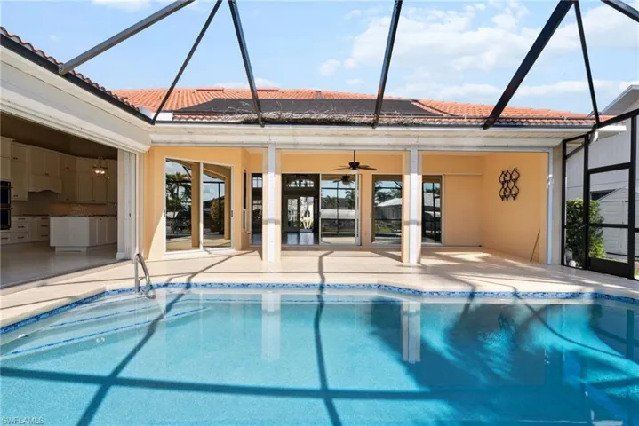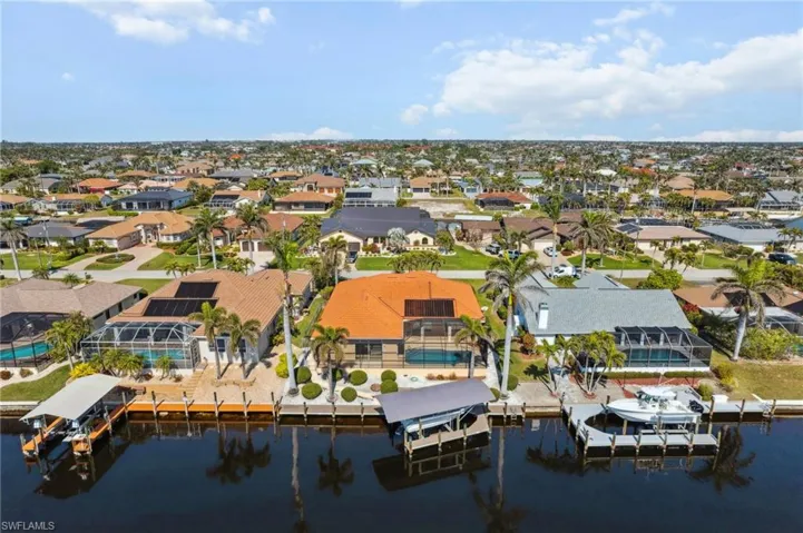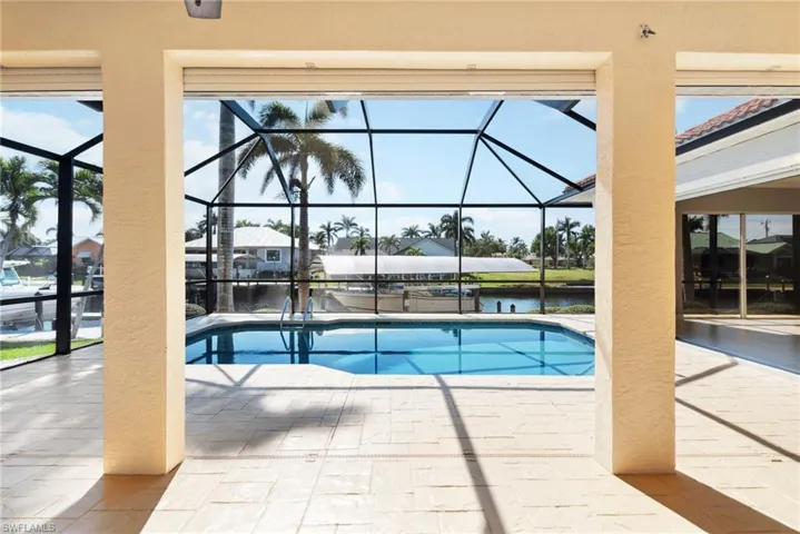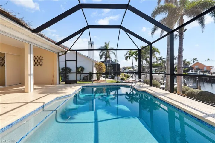 Prime location in a boater’s paradise! Fully renovated with no expense spared makes this breathtaking home move in ready. Boating enthusiast will appreciate the 3-year-old 13,000 lb walk-around boat lift with canopy and deep water direct gulf access canal just a few short blocks from the river. Shows Comparable to newer homes with high ceilings, a dream kitchen with oversized island, exotic stone countertops, coffee bar, and high-end built-in appliances, including a built-in refrigerator, double oven, and ice machine. The spacious family room features a keystone wall with a linear fireplace and sliding glass doors overlooking the canal and pool. Additionally, there are 9’ solid core doors and plantation shutters. The primary suite features an elegant bathroom with dual vanities, a separate whirlpool tub, and a shower. Enjoy the Florida sunshine from the sunny southern exposure pool with a new screened enclosure. Pet lovers will appreciate the convenient fenced dog run and for the boaters, there is an air-conditioned storage room/workshop ideal for storing boat supplies and fishing gear. Electric roll shutters throughout provide easy storm protection and no water intrusion from Ian. Walking distance to Cape Harbour‘s restaurants and nightlife plus abundant dining choices within golf cart distance.