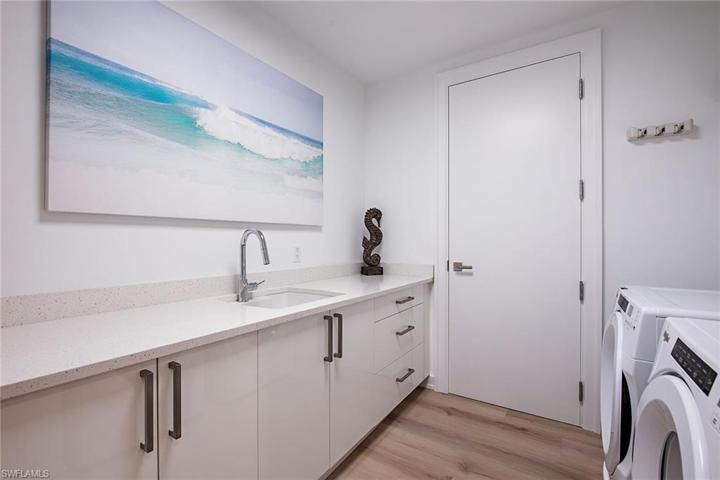 Stunning Eleven Eleven Central corner residence with spacious open floor plan boasting a large great room, open kitchen with quartz island, three bedrooms, three full and one half bath plus a large laundry room. Desired “Fifth Avenue” plan with 10 ft. ceilings and large west facing wrap around balcony. Professionally decorated with upgraded finish selections, added designer lighting, wall coverings, window treatments, custom closet and newly completed gorgeous plank flooring. Unrivaled resort-style amenities include a lap pool with beach entry, fire pits, cabana bar, gas grills, two hot tubs, bocce ball, courtyard park with putting green, fenced-in dog park, guest suites, social room with catering kitchen, theater and fitness center. Prime downtown/Olde Naples location adjacent new dining/entertainment options, across from Baker Park and just blocks away from 5th Avenue, beach access and more. One under-building garage space and climate controlled storage included.