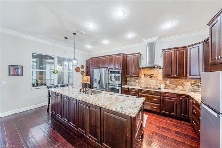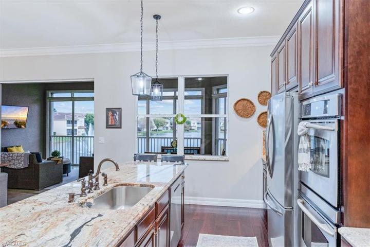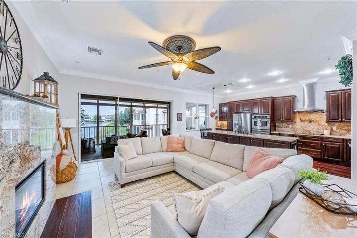 Expanded kitchen with a huge lake view!! With 3 bedrooms + Den, 2.5 baths & a 2-car garage, this residence seamlessly blends comfort & elegance. The open floor plan creates an inviting ambiance, featuring a living room with designer wall and a fireplace, formal dining area & an eat-in kitchen flowing to a glass-enclosed lanai with a captivating lake view. An updated kitchen is a delight with a large island, breakfast bar, stainless steel appliances, granite backsplash, pot filler & a spacious pantry. The owner’s suite is a sanctuary w/a fireplace, sitting area & custom-organized closet, while the updated bathroom boasts dual vanities & a walk-in shower. Additional features include a charming beadboard foyer, tile & wood flooring, ceiling fans & designer lighting. The community, installing new roofs this year, offers a pool, billiards & an events calendar w/game nights, water aerobics, yoga, monthly food trucks, live music, & more. Minutes away from RSW Airport, Hertz Arena, Miromar Outlets & walking/biking distance to Coconut Point Mall, this residence provides comfort & accessibility to desirable destinations.
