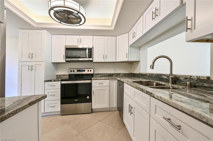 Charming 1st fl unit with recent contemporary upgrades, boasting granite countertops, white shaker cabinets with soft close, all new SS appliances including A/C and HW too. Take advantage of the lowest priced condo in this very desirable community. Enjoy Country Club living with newly refurbished Tennis Courts and Championship Golf Course. For the Golf enthusiast, this is a Bundled Golf community, which means GOLF IS INCLUDED. Beach Goer? Fort Myers Beach, Sanibel and Captiva are 2-3 miles away for you to walk, sunbath or shell hunt. Enjoy the outdoors on your large, screened in lanai overlooking golf, lake and Clubhouse. There are several pools for you to swim in, a restaurant, fitness center and lots of other amenities for you to explore. Feel secure in knowing this is a gated community, close to dining, shopping and RSW airport. This unit has a designated carport and storage unit as well. Low fees, lowest price. Schedule to see it today.