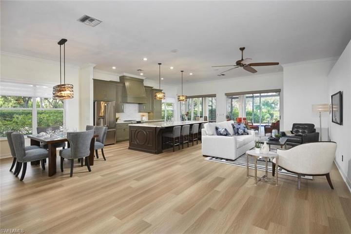 H8378- Welcome to Capri, one of the most sought after subdivisions in Pelican Landing. This renovated single family home with open concept and has been tastefully decorated from the lighting to the lovely paint colors. There is new light colored flooring throughout the main living area, freshly painted kitchen cabinets with an oversized island with quartz countertops. The lanai overlooks a beautiful lake and a coastal tiled pool. The master bathroom has been completely renovated with double vanities, quartz countertops and a gorgeous tiled shower with glass doors. This property also includes a den with an additional half bath. Plantation shutters on all windows throughout the house and hurricane shutters on the lanai. Pelican Landing is a an amenity rich community with a private beach island, kayak park, tennis center, fitness center, pickle ball, bocce and community center for a very modest association fee.