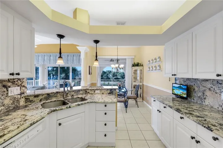 Welcome to this beautifully maintained second-floor end-unit retreat offering exceptional privacy, generous living space, and tranquil lake views. This TURNKEY 3 bedroom residence features a rare 2-car attached garage and is move in ready with carpeted main living areas in pristine condition and soaring volume ceilings that create a bright, open atmosphere throughout. A convenient chair lift on the staircase adds ease and accessibility, making everyday living comfortable and effortless. The sun-filled kitchen is both stylish and functional, showcasing granite countertops, white raised panel cabinetry, white appliances, and a built-in buffet for added storage and serving space perfect for entertaining or casual dining. The spacious primary suite is a true sanctuary, offering private access to the lanai and an inviting ensuite bath complete with dual sinks, raised vanities, a soaking tub, and a walk-in shower with updated tile. A generously sized guest bedroom features a built-in desk, ideal for a home office, hobby room, or flexible living space. Step onto the expansive screened lanai and take in the peaceful lake views highlighted by three charming fountains, creating the perfect backdrop for morning coffee, evening cocktails, or simply unwinding in your own slice of paradise. This exceptional condo blends comfort, thoughtful upgrades, and serene surroundings all in one move in ready home designed for enjoying the very best of Florida living. Rest easy with the added protection of stone-coated steel roofs installed community-wide in 2020. Located within the gated community of Lighthouse Bay, residents enjoy exceptional resort-style living with access to five swimming pools, including a lap pool, 2.5 miles of scenic walking and jogging paths, tennis courts with a pro on staff, a robust bocce program, two boat houses, a fitness center, sauna, clubhouse, library, and an Arts & Learning Center. As an added bonus, a Bronze Membership to the Brooks Commons Club is included, granting access to a private restaurant, enrichment center, pickleball, and vibrant social programs, Gold Memberships available for upgrade granting access to The Commons Club Private Beach where chaise lounges and umbrellas are provided, Ice/Water dispenser, conveniently located restrooms and Beach Parking Reservations (during construction of the new club). Ideally located just minutes from Coconut Point Mall, dining, entertainment, Southwest Florida International Airport, and pristine Gulf beaches, this home offers the perfect blend of comfort, convenience, and Florida lifestyle. *Some photos edited to show white wall color.