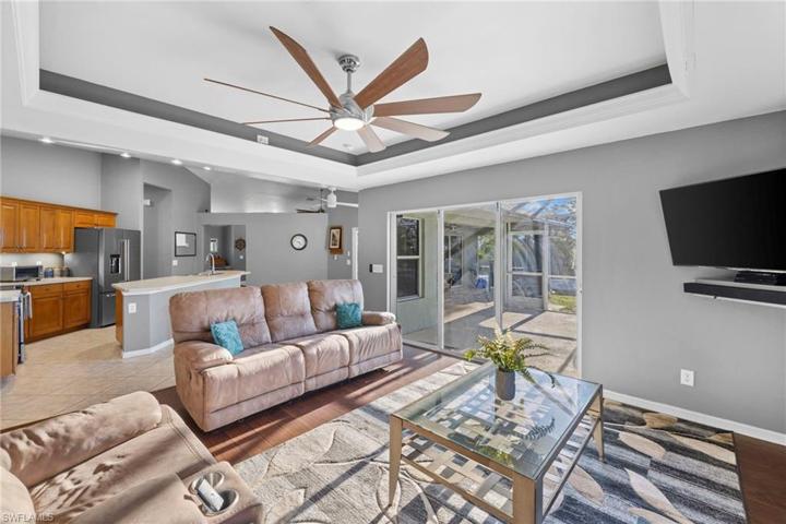 Step into this well-maintained 3-bedroom, 2-bathroom home perfectly situated in a quiet and safe neighborhood on a corner lot in NW Cape Coral. The spacious layout features a formal living and dining area as well as a large kitchen with an oversized island that seamlessly integrates with the family room for relaxed gatherings. The master bedroom offers an ensuite bathroom with a shower-tub combo and dual sinks. Outdoors, enjoy a private pool overlooking the adjacent wooded area that provides a feel of serenity and peace. Conveniently, the home is just a short 1-mile hike from the water and near Burnt Store Marina with several other boat ramps accessible within a 10-minute drive. Don’t miss out on this gem of a property! *BRAND NEW ROOF!*