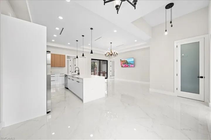 The interior boasts soaring high ceilings and premium tile flooring throughout. The chef’s dream kitchen is anchored by a spectacular 10-foot waterfall island, complemented by premium custom cabinetry, high-end finishes.