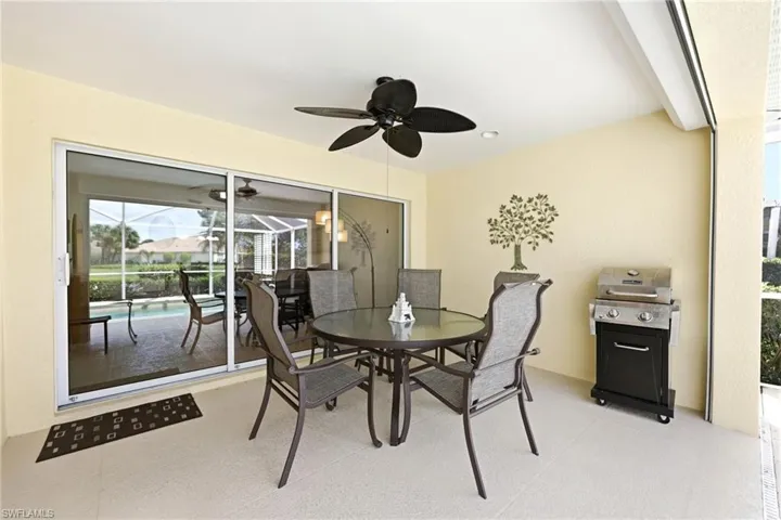 Beautiful outdoor space with a private screened lanai featuring a heated Pool and Peaceful lake view, ideal for enjoying sunny afternoons and evening sunsets. The covered outdoor seating area provides the perfect space for dining or unwinding in the shade. Inside, the home features a clean, updated kitchen with white cabinetry and stainless steel appliances, along with spacious living and dining areas designed for comfort and functionality. The primary suite and guest bedrooms are thoughtfully furnished, offering a welcoming and restful atmosphere. Residents of VeronaWalk enjoy an exceptional resort-style lifestyle including 24-hour guarded gate access, resort and lap pools, fitness center, tennis and pickleball courts, bocce, basketball, clubhouse, restaurant, cafe, post office, gas station, beauty salon, and miles of scenic walking and biking paths. Ideally located just minutes from the beaches and world-class dining of Naples and Marco Island.