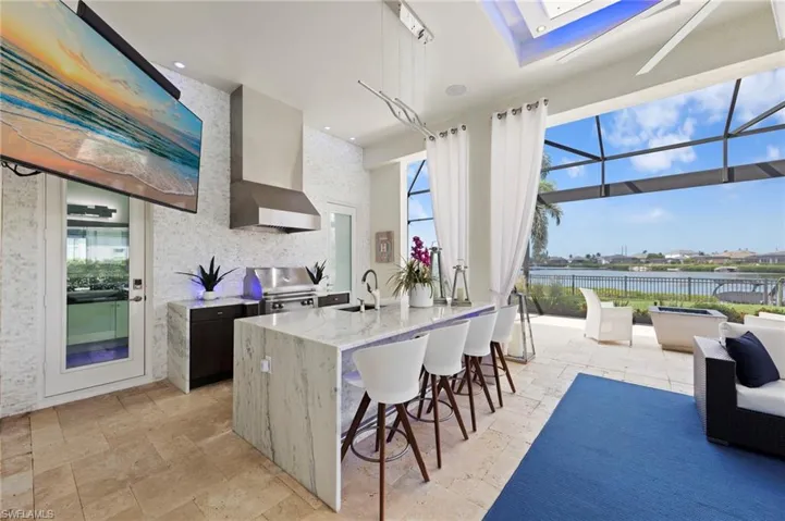 The upscale, 76-home, gated community of Hidden Harbor welcomes you to this stunning custom residence. Built by Stock Development in 2017, this extensively optioned home is perfectly positioned on the most desirable, south-facing, elevated and oversized lot. It comes complete with a private dock and separate boat lift offering direct Gulf access. A set of double entry doors open into a coastal contemporary masterpiece featuring 4 bedrooms and 4.5 bathrooms. The open floor plan is defined by clean architectural lines, soaring 13’ ceilings, and real wood beams. A striking white stacked stone feature wall creates a dramatic focal point echoed in the outdoor space and great room, where a sleek linear fireplace adds warmth and sophistication on those cooler evenings. The chef’s kitchen with shaker-style cabinetry in contrasting tones, integrated stainless steel Monogram smart appliances, a gas cooktop, and quartz tops. An oversized waterfall island provides seating for four. The spacious primary suite complete with dual walk-in closets and a luxurious ensuite bathroom featuring a freestanding deep soaking tub, a walk-in shower with body jets, and dual vanities adorned with hand-spun glass vessel sinks. All bathrooms throughout the home feature Kohler fixtures, floating vanities for a clean, modern aesthetic, while every closet is outfitted with custom cabinetry. Step outside to your private resort-style oasis where no expense was spared. The huge, commercial size, custom, gas heated salt-water pool features a unique zero-edge design with a pebbled finish, complemented by a large spa, sun shelf with in-water loungers, and a dramatic 13’ linear gas fire feature set against an 8’ cascading linear waterfall. The expansive Superscreen enclosure covers a sprawling travertine deck, complete with a gas fire pit and a fully equipped outdoor kitchen with an Alfresco gas stainless grill/smoker, sink, refrigerator, and waterfall-edge marble counters. This home is equipped with extensive smart home and wi-fi technology, including automated door locks, Lutron controls, security system, Pentair pool controls, Nest thermostats, camera system, Philips Hue lighting, Luton window shades throughout, and more. Additional highlights include a den/office, laundry room with refrigerator, new dual washers and dryer, an air-conditioned 3.5-car garage with cabinets, whole-home Generac generator, impact-resistant doors and windows, integrated multiple zone sound system, surge protection, LED lighting, chandeliers, Halo air purification system, and engineered oak hardwood flooring throughout. Residents of Hidden Harbor enjoy exclusive access to a private, well-equipped clubhouse featuring a pool, outdoor kitchen, fitness center, kayaks, fire pit, and community boat dock. Ideally located, this peaceful waterfront enclave offers convenient access to US-41, I-75, RSW International Airport, as well as premier dining, shopping, healthcare, and Southwest Florida’s beautiful beaches.