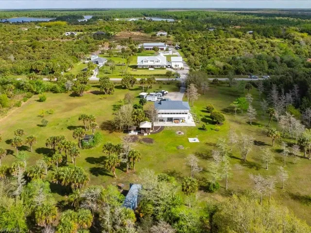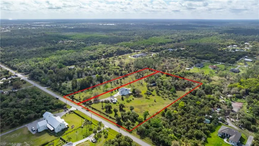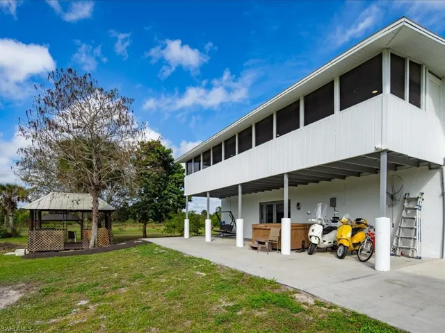 renovated main (second) floor living area including beautiful 30 inch tile, custom kitchen with quartz counters, Bosch refrigerator, Fisher & Paykel dishwasher, large pantry, 16 new impact windows, two new HVAC units as well as fresh interior/exterior paint. There are three bedrooms and two full baths upstairs along with three sets of French doors and a 40 ft. wide screened lanai that runs the entire width of the property with PREFERRED SOUTH EXPOSURE. The first level is mostly unfinished but full of possibilities. It has a bonus 4th bedroom, 3rd full bath, separate HVAC as well as impact french doors leading to a large outdoor patio. The long list of outdoor features include: paved driveway, 5 gates situated around the property perimeter, two gazebos with electric, shed with water/electric/air compressor, fire pit, a wide variety of fruit trees, 10’ x 40’ shipping container (ideal for extra storage,) chicken coup, target practice area, commercial-grade lighted flagpole and even a charming tiny “doll house” on the property! Survey, list of upgrades, environmental reports on both lots and map of fruit trees available. This is an amazing piece of property and incredible opportunity with plenty of room to grow and enjoy the estates lifestyle.