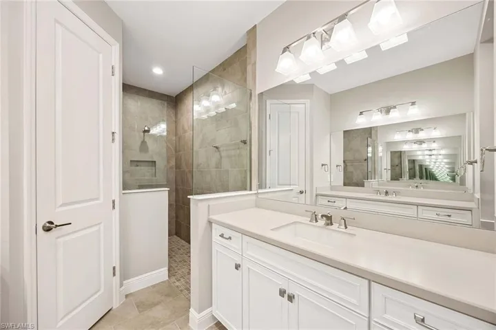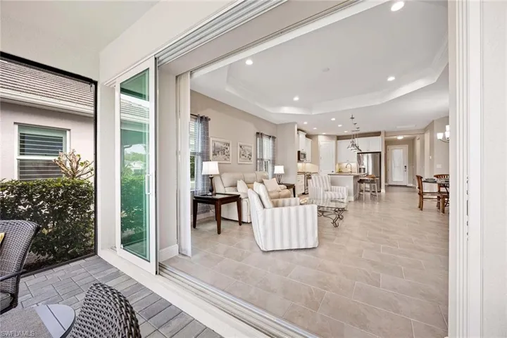 Located in Marquesa Isles, this two-bedroom plus den residence blends timeless design with modern upgrades. The foyer opens to 9-foot ceilings, 8-foot doors and 24-by-12-inch ceramic tile flooring in the main living areas. Glass French doors lead to an 11-by-12-foot den, suitable for a home office, reading space or guest accommodations. The open kitchen features an oversized quartz island, G.E. stainless steel appliances, designer tile backsplash, 42-inch cabinetry with crown molding and under-cabinet lighting. The 16-by-17-foot great room includes a coffered ceiling with crown molding and southern exposure lake views. The primary suite includes a walk-in closet, additional closet, and an en-suite bath with dual sinks and an oversized, designer-tiled shower. The screened lanai spans 14-by-10 feet with a 10-foot extension and sunshade, overlooking the lake. Additional features include impact pocket sliding doors, plush bedroom carpeting, custom window treatments, Smart Hub integration with Z-wave devices, Hotwire fiber-optic service, and an 18-by-20-foot garage with epoxy floor, insulated door and attic insulation. Marquesa Isles amenities include a clubhouse, resort-style pool and hot tub, dog park and landscaped grounds, all within a gated community close to Naples shopping, golf and beaches.