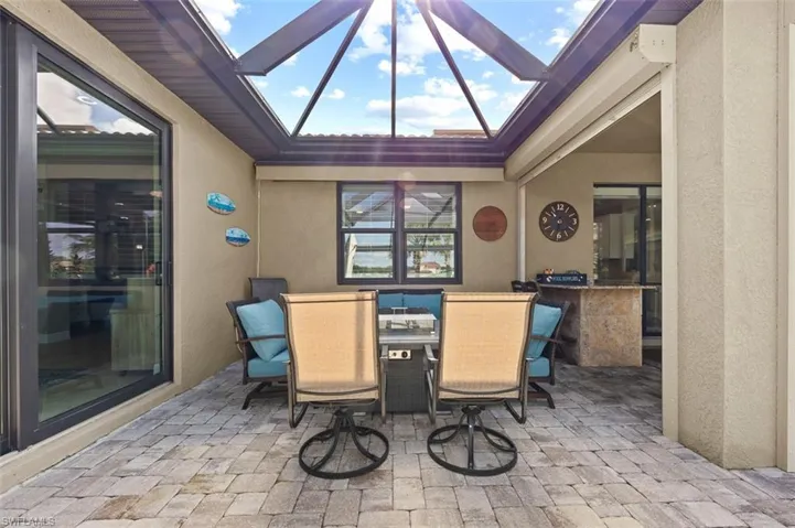 So many upgrades the builder wouldn’t recognize their own home! This one of a kind 3 bedroom, 2 bath, bonus room, with extended lanai and pool home on a stunning lakefront lot, near a cul de sac has NO COMPARISON! The attention to detail starts on the outside with the low maintenance landscaping, concrete curbing, screened front entry, custom glass door, and gutter system. Efficiency and easy living continue to be provided by the whole house RO system, generator hook up, Honeywell Wi-Fi smart thermostat, and impact windows & doors along with locking roll down shutters for the covered portion of the lanai for additional storage and/or protection. The interior has neutral yet modern tones, 8’ doors, custom wall moldings, chair rail, custom stained and sealed grout, all refreshed within the last year. Two bedrooms boasting walk-in closets with built-in shelving and a full guest bath are at the front of the home. Across the beautiful foyer from there is the spacious, designated laundry room with built in cabinetry and the garage entry. Moving into the great room you find the light and bright white kitchen featuring pull outs on all lower cabinets, white quartz countertops, a custom backsplash, stainless steel appliances, and an island with a custom tile under the bar. This leads seamlessly into the dining area looking directly over the pool and lake beyond. The dining area also features an accent wall. Both kitchen and dining are open to the living room which showcases another subtle, yet modern accent wall and large window also overlooking the pool and lake. The already sizable primary suite is at the rear of the home. There is a large 14X20 addition off of the primary suite which leads out to the pool deck. Can be used as an office, den, sitting room, gym, or even an extra sleeping area. Separated by stunning barn doors, the possibilities are endless! Primary bath offers dual sinks, stand up shower, and a large walk in closet with custom built in shelving for maximum storage. Other upgrades like plantation shutters and ceiling fans with LED lighting throughout make this home move in ready for anyone! Now, let’s talk about the exterior…The 15×30 heated, salt water pool with sun shelf and bubblers was installed in 2020. All equipment stays and has been professionally maintained since installation. Your guest can enjoy relaxing in the pool or on the deck while you easily offer drinks and snacks in the gorgeous outdoor kitchen complete with sink, fridge, marble backsplash, granite counter tops, and stainless steel outdoor cabinetry for additional storage. Maximize your outdoor living with or without the harsh sun using your brand new retractable awning! Let’s not forget the sunsets! Whether your inside or out, you can enjoy unobstructed views of our beautiful sunsets through the picture window screen of the pool cage. What more could you ask for?!? Must see to truly appreciate this rare gem in a very popular resort style community.