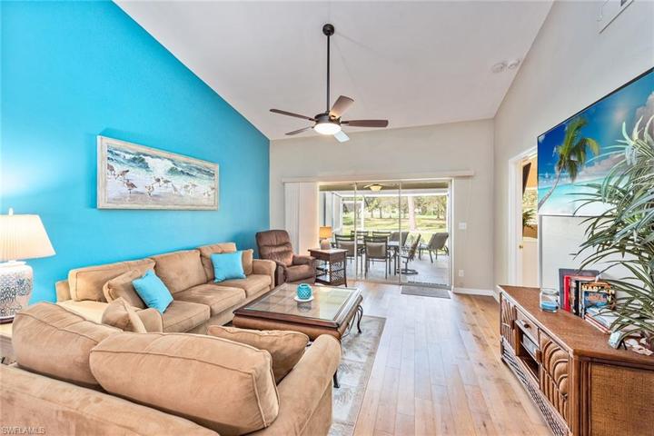 Stunning 2-bed, 2-bath residence with a den offers long golf course views that promise to take your breath away. As you step inside, you’ll be enthralled by the main living area’s vaulted ceiling, beautifully complemented by hardwood flooring that reflects a blend of style and warmth. The den features glass panel French doors, creating the ideal space for reading or working from home. Pristine white cabinets, granite countertops, stainless steel appliances, and a conveniently designed pantry in the kitchen are a chef’s dream. The master and guest room are dressed in plush carpeting, each boasting ensuite bathrooms featuring updated white vanities set against bevel-edged granite countertops. Experience stunning golf course vistas in the screened-in lanai while dining alfresco or sunbathing under the Florida sun. Additional perks include NEWER HVAC, security system, decorative paver driveway, and a 2-car garage. Perfectly positioned between downtown Naples and the beaches of Marco Island, placing the best shopping, dining, and entertainment at your fingertips. Don’t miss this opportunity!