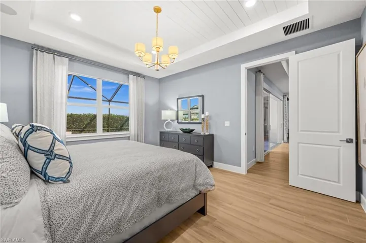 The spacious primary suite is a true private retreat, featuring generous proportions, designer accents, and a luxurious en-suite bathroom with two walk-in closets. Additional bedrooms, bathrooms, and the den are located near the front of the home, providing functional separation of living space for all.