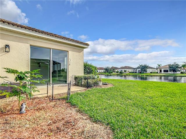 Great opportunity to purchase this home in desirable Hampton Village in Ave Maria! This 3 bedroom plus den, 2 bath waterfront home features a very spacious layout with updated appliances (2021), air handler replaced in 2020, new laminate flooring in all bedrooms, built-in entertainment center, full closet system in master bedroom, cabinets in laundry with sink, extra fridge and cabinets in garage . The unique exterior offers a porte cochere (covered carport) with easy access to side entrance. Enjoy the SWFL weather in your covered lanai while you appreciate the lake views! Walking distance to the town center where you can enjoy shopping, restaurants, gym, and more! Ave Maria community offers miles of walking/bike paths, waterpark, dog parks, tennis, bocce ball and playgrounds.