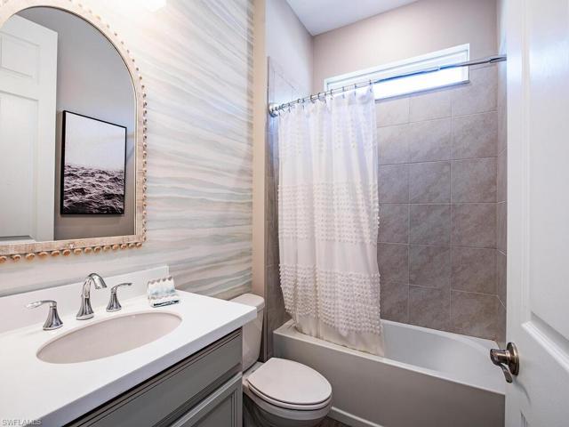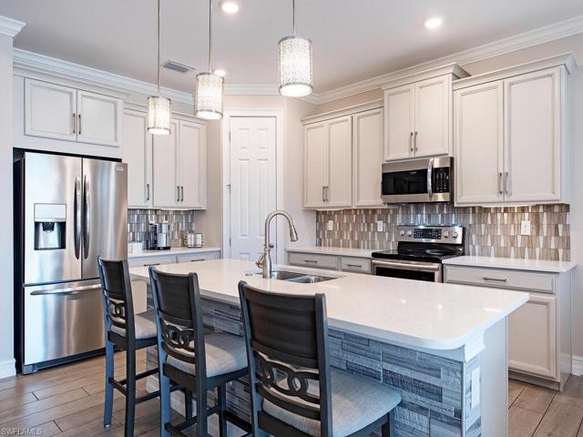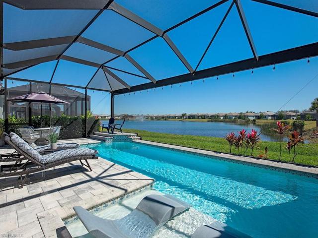 Welcome to the like-new, coastal style home you’ve been searching for in the resort community you’ve been dreaming of. Savor your morning coffee in the expansive picture-frame screened lanai while watching the sunrise over the sparkling lake, spend the afternoon lounging in the sun after a refreshing dip in your heated, saltwater pool then host a backyard BBQ grilling in the outdoor kitchen. Inside the open floor plan is perfect for entertaining allowing guests to mingle comfortably between the great room, spacious kitchen and dining area. With light pearl-grey soft-close cabinets, stainless steel appliances & quartz countertops the bright kitchen is timeless. The “wood” plank tile flooring throughout is as carefree as it is gorgeous. Master suite features a large custom finished walk-in closet & beautifully appointed bath. Impressive décor includes plantation shutters, designer lighting, fans, professional interior paint, finished garage floor, wallpapered baths with custom mirrors & crown molding. This popular Ashbury floor plan offers over 2,400 sq. ft., 4 bedrooms plus a den so there is plenty of space for family & friends. Located in Seasons at Bonita where you can fill your days with friends at the amenity center. Play on one of the three tennis courts, eight pickleball courts or six bocce courts. Relax & unwind in the captivating resort style pool & spa or nap in a hammock under a shady palm at the sandy “beach”. The clubhouse offers opportunities to socialize in their spacious multi-purpose room or workout in the fitness center. Don’t miss an opportunity to own this exceptional home in one of Bonita’s most popular communities. Centrally located with easy access to Naples & Fort Myers close to I-75, fantastic shopping, restaurants and beaches. New shopping and dining opportunities coming soon to Midtown at Bonita.