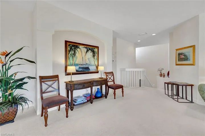 Wake up to a panorama of tranquil lake views and end each day watching the water reflect the Florida sky from your private screened lanai. This beautifully positioned end-unit residence in Southbridge at Pelican Landing captures a rare combination of long lake vistas, a charming water feature and a direct line of sight to the community pool, all framed by lush landscaping and unmatched serenity. Spanning 2,155 square feet, this fully furnished home offers three bedrooms and two baths within an open-concept layout designed for comfort and flow. Volume ceilings elevate the main living areas, while the kitchen is flanked by a dining area and a casual breakfast nook, making entertaining seamless. The large primary suite enjoys lake views, double closets and a spacious bath, providing a peaceful retreat. Residents of Pelican Landing enjoy access to a private beach park, tennis and pickleball facilities, a fitness center, sailing club, canoe and kayak park, and a full calendar of community activities, all within one of Southwest Florida’s established gated enclaves.