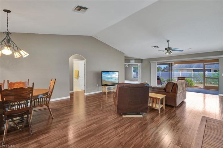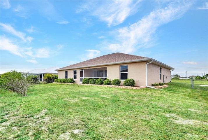 All Reasonable Offers will be considered. Excellent Opportunity to own this Super Clean 3 Bedroom + Den, 2 bath Cape Coral home with 1,799 sq ft of Living Area, an Open Floor Plan and Split Bedrooms. Perfect Family Home or Investment Property. Features include a New Roof 2023, New Seamless Gutters 2023, New AC 2019, New Water Heater 2019, New Exterior Paint 2023 and Interior Paint 2021, New Pergo Flooring 2021, New Well 2011, All Impact Windows and Hurricane Shutters for Sliding Glass Doors, Vaulted Ceiling, and Inside Laundry room. The Good-sized Kitchen has a Breakfast Bar and Pantry. The Owners Suite includes a Walk-in Closet, Dual Sinks, Walk-in Shower and a separate tub. You will love the Screened Lanai and Large Fenced Backyard, with plenty of room to add a Pool. NOT IN A FLOOD ZONE! City of Cape Coral proposed schedule for utility expansion in this area is 2035. Conveniently located close to Restaurants, Shopping, Schools, and just a short drive to RSW International Airport and the Punta Gorda Airport.