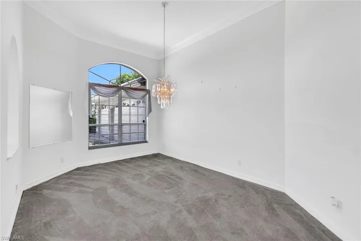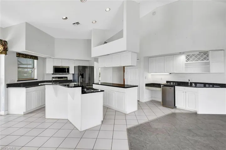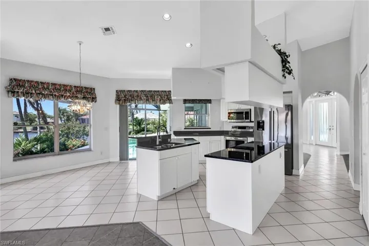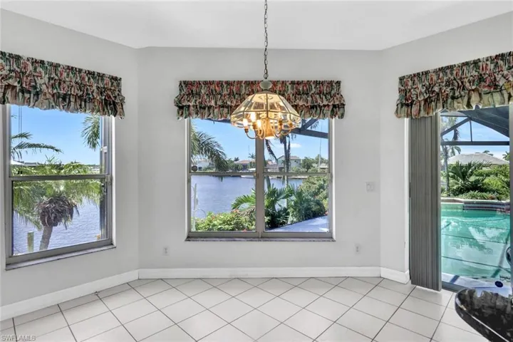 The kitchen and living room also offer stunning canal views and open onto a spacious screened lanai and pool area through 8-foot sliding glass doors. The living room features vaulted ceilings, a wet bar, and a convenient half bath. The oversized primary bedroom, complete with tray ceiling and two walk-in closets, offers serene canal views and an ensuite bath with a separate tub, shower, and dual sinks.