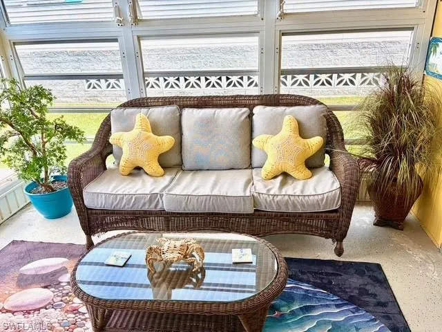 AFFORDABLE waterfront living in a true Florida 2/2 home on a canal with boat dock, deck, 2 porches, and lovely coastal décor. Fully renovated and upgraded post-Ian (2023), this open concept living space and kitchen boasts large peninsula island in leather finish granite which looks like sand dunes and waves on the beach. Kitchen with Whirlpool appliances even has dishwasher and garbage disposal. 1 bright lanai in the front to greet your guests, and one in the back of the home leading to the rear deck with bench seating overlooking the canal, and 10,000# boat lift with new motors and water/power at the dock for boat washing and fish cleaning. This furnished home has HVAC and 6 ceiling fans to keep you cool year round, and windows galore with blinds to let the light in. Storage room (12 x 12) between the 2 porches has washer / dryer and storage for beach chairs, kayaks, etc. This home has many thoughtful touches and décor items you must see to appreciate. Located in the highly desirable Bayside Estates, you are only 2.5 miles by car to the famous Fort Myers Beach and 10 minutes by boat to the Bay and Gulf. This convenient and well-maintained 55+ community has pool, pickle ball, tennis, community center with amazing events year round.