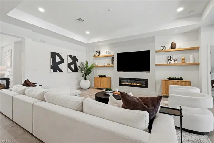 The living area is truly a showstopper with tray ceilings, a custom-built fireplace, and bespoke shelving that add warmth and character to the space. Recessed lighting throughout the home sets an inviting mood, while impact windows and doors allow natural light to flood in, all while providing peace of mind. Triple sliding doors open up to an expansive pavered, panoramic screened-in lanai surrounding the saltwater heated pool and spa, offering breathtaking views of the private preserve just beyond your backyard.