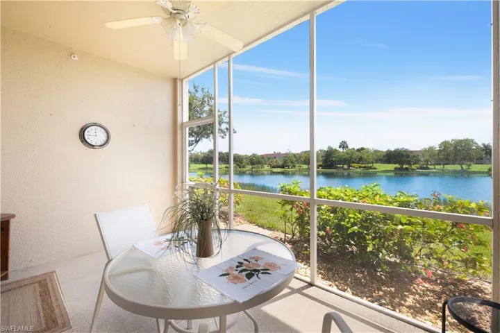 This 2-bedroom 2 bath plus den condo with gorgeous wide & long lake and golf course views in desirable North Naples is in pristine condition and meticulously maintained. So peaceful, it’s hard to believe that it’s minutes to I75, shopping, fine dining, entertainment, and so much more! Two large covered screened-in lanais are perfect for entertaining guests or sipping your favorite beverage while enjoying the lighted water feature. Convenient single car garage to protect your valuable asset is just steps from your front door with guest parking directly across the street. The great room is generous with a built-in dry bar, crown moldings, beautiful neutral tile to go with any décor, and a phenomenal view! The eat-in kitchen is spacious! The main bedroom features double walk-in closets, carpet, and a picturesque view. Main bath is shower only with dual sinks, ideal for all your personal items. The guest bedroom is sizable and will comfortably accommodate your guests. The den is fabulous with a uniquely fashionable light fixture for the golf enthusiast. The laundry closet has a washer/dryer and plenty of space for your sundry items. Some of the amenities include several sattlelite pools, clubhouse, excercise room, restaraunt and of course Golf!