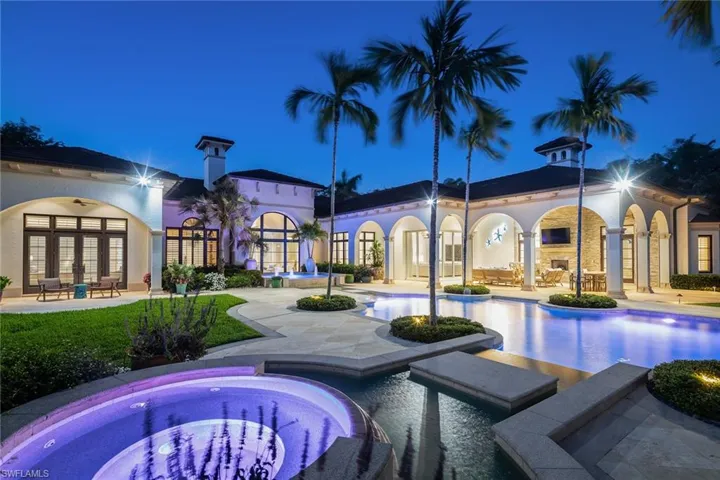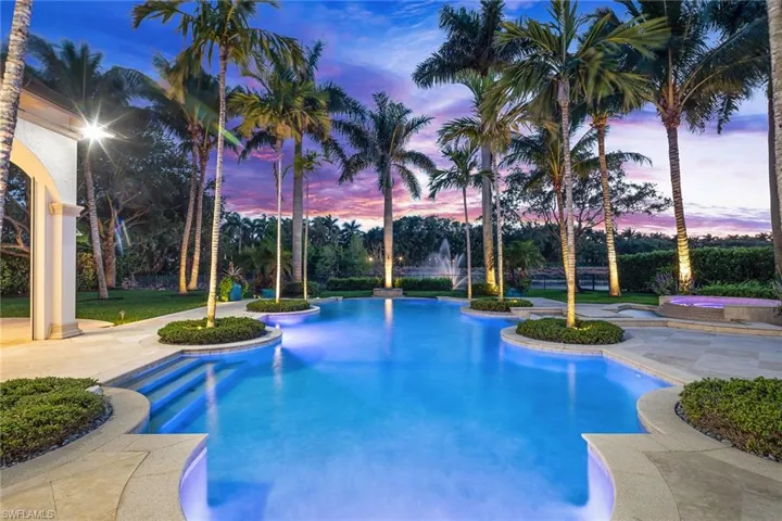 On one of the most desirable lots in Escada at The Ritz-Carlton Tiburón, this is a rare opportunity to own a thoughtfully updated luxury estate with sweeping lake and golf course views. Move-in ready, this light and bright residence offers an expansive floor plan all on one level, featuring soaring ceilings, European white oak flooring, custom millwork and designer lighting that create a refined ambiance throughout. Multiple living areas are designed for relaxation and entertaining, including a stunning open-concept gourmet kitchen with neutral finishes, custom cabinetry, a large island, gas cooking, and top-of-the-line Wolf and Sub-Zero appliances. The expansive primary suite is a private retreat with spa-like finishes, dual closets, dual baths and French doors opening to the covered lanai. Three generously sized guest suites, a large den, and a separate study provide flexible space for comfort and functionality. Outdoors, enjoy a resort-style setting with an impressive gas-heated saltwater pool and spa, water features, summer kitchen, fireplace, covered living areas, upgraded lush landscaping, and a spacious patio overlooking the 14th fairway with preferred southwestern exposure. Additional highlights include impact glass with electric shutters and screens, whole-house generator, newer roof, updated pool equipment, newer HVAC systems 2020–2025 and more. A three-car garage with circular drive and a double-gated entrance complete this exceptional offering. Tiburón membership is optional for access to championship golf, beach privileges and world-class resort amenities. This property represents the pinnacle of Naples living, where timeless luxury meets everyday comfort in a premier gated community.