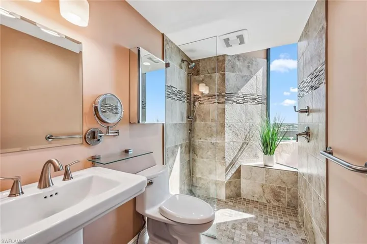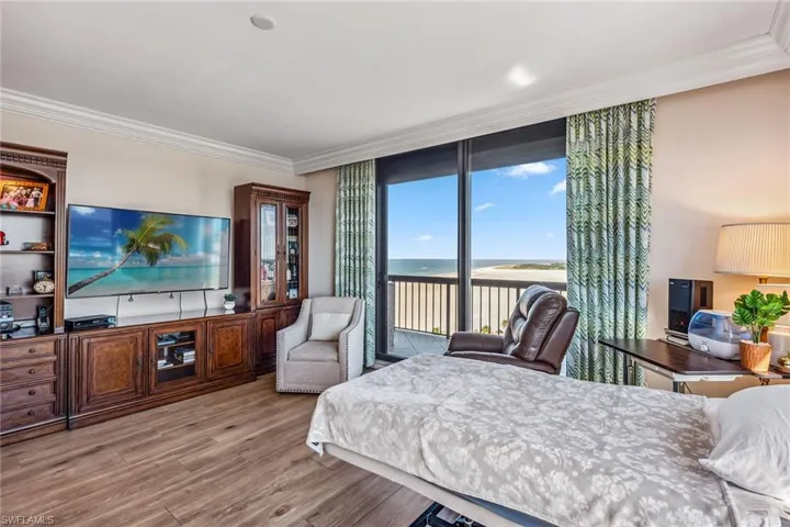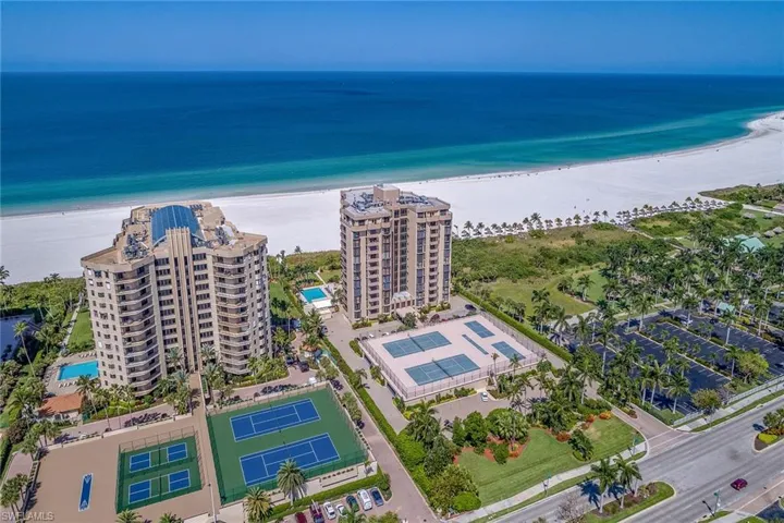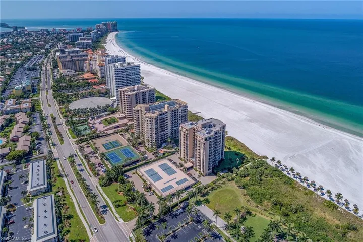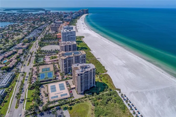 This rarely available beachfront penthouse in the prestigious Princess del Mar offers an unparalleled living experience on Marco Island’s award-winning Crescent Beach. With stunning, panoramic views of the Gulf of Mexico and unobstructed vistas of the sugar-sand beach due to the extraordinary location next to the popular Resident’s Beach with no building next door, this prime residence provides a remarkable coastal lifestyle. The spacious two-bedroom, two-full bath floor plan features an expansive wrap-around balcony with impact glass and electric storm shutters, offering covered outdoor living space and breathtaking views of the ocean, cityscape with gorgeous island views, and sunsets. A built-in grill makes alfresco dining a pleasure. Inside, the residence boasts elegant hardwood flooring and crown molding throughout. The open concept living and dining area is ideal for entertaining, with direct access to the lanai through sliding doors and a cozy fireplace framing the incredible ocean views. A dry bar with custom shelving adds convenience and style. The kitchen is beautifully appointed with recessed lighting, wooden shaker-style cabinets, tile flooring, a breakfast counter, built-in desk area, and stainless-steel appliances, including a French door refrigerator, range with warming drawer, dishwasher and microwave. A window above the kitchen sink offers a delightful view, and the front-load washer and dryer provide modern convenience. The owner’s suite is a private retreat with stunning views, lanai access and two walk-in closets. The en-suite bath features a large jetted tub for ultimate relaxation. The guest bedroom is adjacent to a full bath with a walk-in shower, frameless glass enclosure, bench seating and floor-to-ceiling tile, offering a luxurious experience for visitors. Furnishings are negotiable, and the unit includes a private two-car garage. This exceptional penthouse is uniquely positioned with no neighboring buildings to the north, enhancing privacy and views. The Resident’s Beach next door offers events, picnic tables and the Paradise Grill, an additional perc with membership only $200 per year as of the time of this listing. Owners at the Princess del Mar enjoy a wealth of amenities, including a resort-style pool, hot tub, boardwalk to the beach, barbecue area, fitness room, library, billiards room, and tennis, pickleball and shuffleboard courts. A guest suite is also available for visitors. Conveniently between JW Marriott Beach Resort where you can enjoy the sunset celebration and Marco Island Resident’s Beach, this home offers the ideal blend of luxury, comfort and easy access to all of Marco Island’s finest coastal offerings. Enjoy the beach, yoga on the beach, fishing off the beach or relaxation. Close to the island’s popular amenities including yacht club, marinas, golf courses, executive airport, boutiques, museum, art center, parks, library and schools.