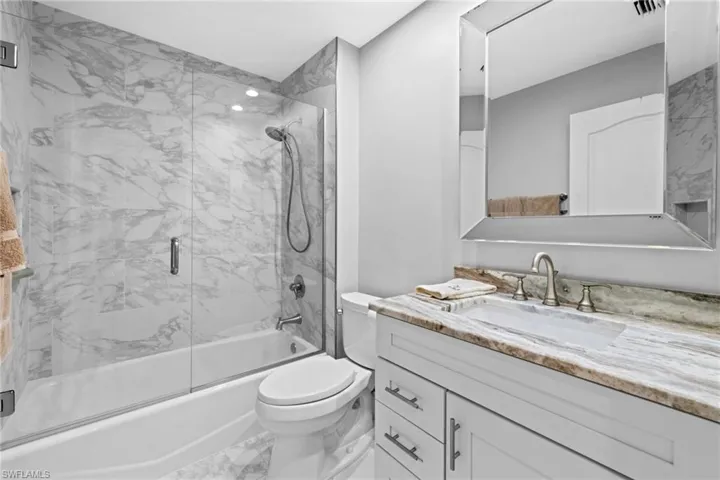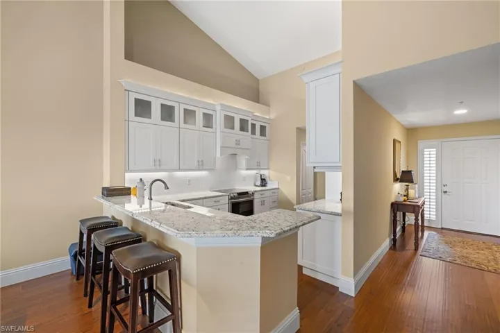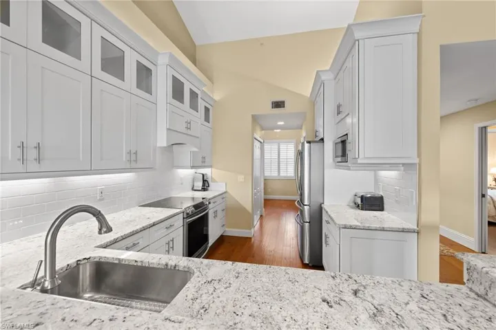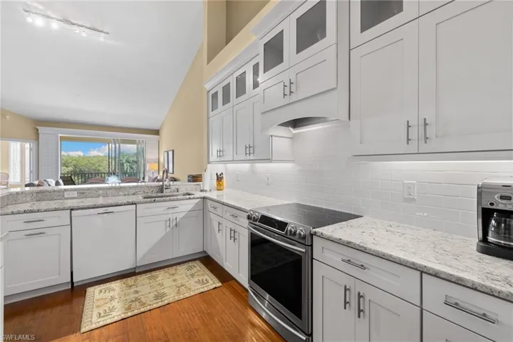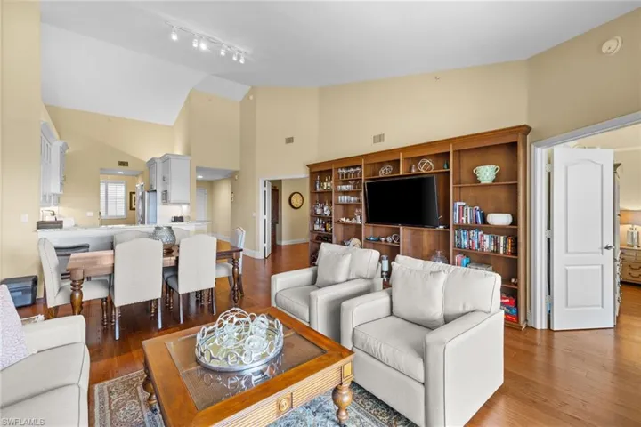 Beautifully updated 2-bedroom + den, 2-bath top-floor condo in Windward Cay at Windstar on Naples Bay, offering exceptional views of Windstar’s 7th fairway and desirable southwest exposure. This spacious residence features soaring ceilings, rich wood flooring throughout, and a stunning renovated kitchen with high-end appliances, crisp white shaker cabinetry, and granite countertops. Both bathrooms have been tastefully updated with modern finishes, creating a refined coastal aesthetic throughout. Offered furnished for a seamless, move-in-ready experience. The private single car garage provides added convenience and valuable storage.
