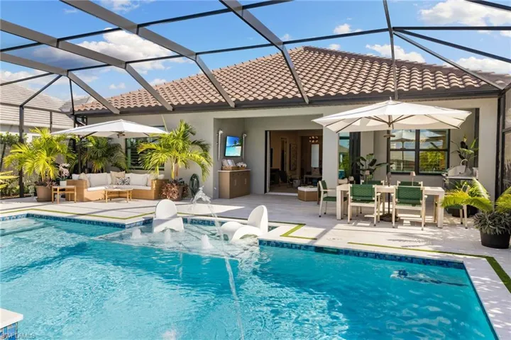 The living and dining areas flow seamlessly to a private screened lanai through expansive openings, designed for true indoor-outdoor living. Outdoors, the custom pool is a showpiece—featuring inlaid glass tile, deck jets, a waterfall sun shelf with three bubblers, sealed white Carrara marble decking, and a natural gas heater, allowing for year-round enjoyment. A fully equipped outdoor kitchen includes a refrigerator, oversized sink, and a 4-burner natural gas grill with sear burner, making the space ideal for entertaining. Additional outdoor highlights include a 3-hole putting green, super-screen pool cage and front entry porch, and LED Bluetooth-controlled landscape lighting in both the front and rear of the home.