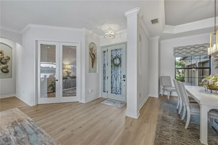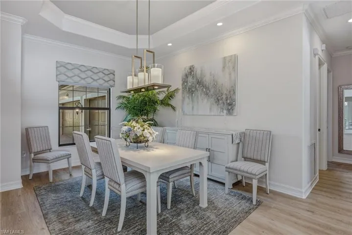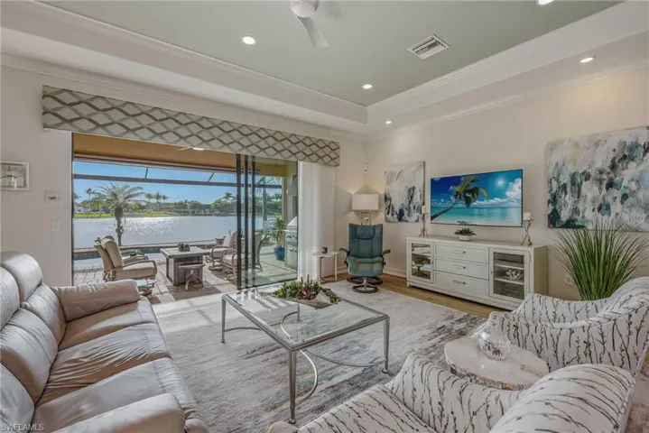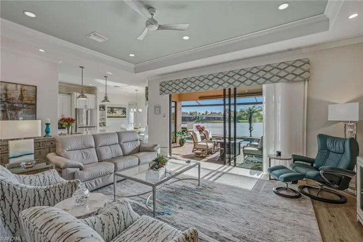 This stunning “Napoli” model home offers an unparalleled blend of luxury and comfort in the highly sought-after Treviso Bay Golf community with FULL TPC golf membership! From the moment you step into the foyer, you feel an immediate sense of sophistication with your eye drawn to the amazing water views! The open-concept design seamlessly connects the kitchen and living areas, making it ideal for both everyday living and elegant entertaining.This home has been very well maintained and thoughtfully upgraded! This home offers a split floor plan, newly painted interior and exterior and new vinyl flooring throughout! Both the primary closet and den have California Closet system installed. The chef’s kitchen is a true showpiece, featuring quartz countertops and backsplash, a natural gas stove, premium stainless steel appliances. The home has been professionally decorated with new lighting, Hunter Douglass shades, power drapery, designer furniture and accessories. The showcase lanai offers amazing water views through the newly added panoramic screened cage, Storm Smart hurricane shutters, outdoor kitchen with beverage cooler and a propane fire pit to relax after a long day! Complete replacement of Pool equipment including pump, heater, filter, pool/hot tub lights and addition of smart home pool control (wifi). The home is equipped with a Kohler generator providing whole house electrical backup, hurricane rated doors, windows and garage doors for peace of mind as well as a 220V electrical outlet in garage (for electric vehicle charging). For ease of living the HVAC is only 5 years old, addition of Lutron Smart home hub that allows for verbal control of lanai