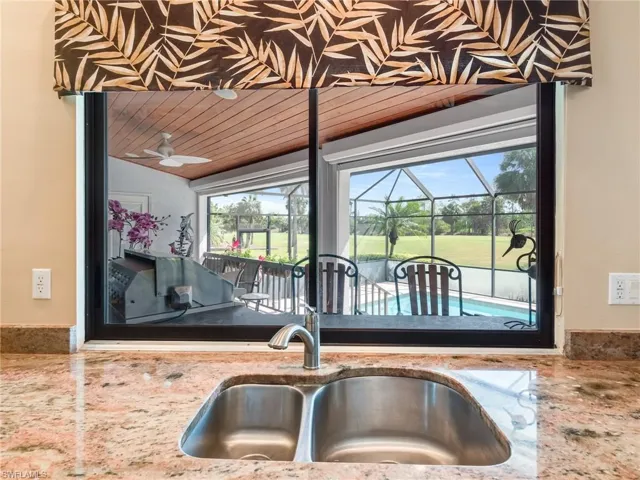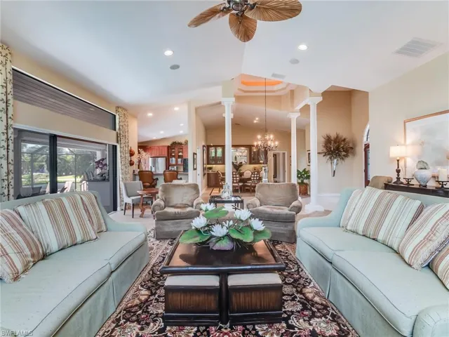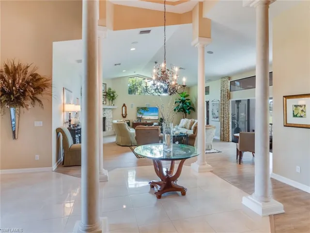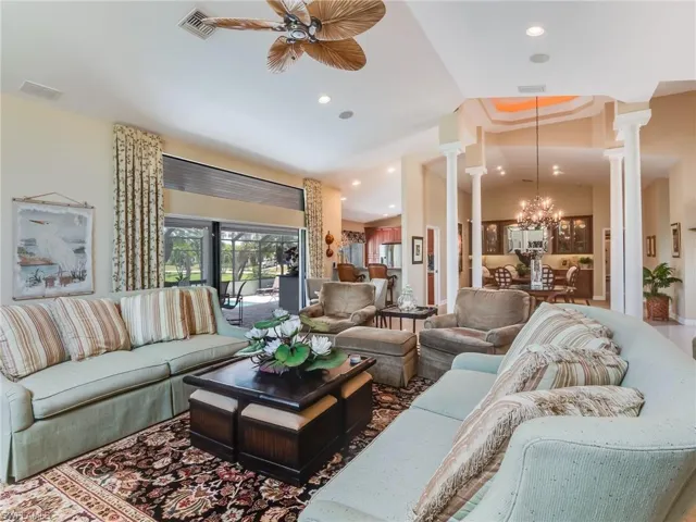Welcome to your dream home in the prestigious Forest Country Club, a gated community renowned for its beautiful landscaping and exceptional amenities. This stunning 3-bedroom, 2-bathroom elevated home boasts over 2,550 square feet of interior luxury. As soon as you step inside you are greeted by a magnificent pillar foyer with trey ceilings, seamlessly connecting the great room, dining room, and kitchen into an open-plan masterpiece. Tall cathedral ceilings circulates throughout the entire home. The kitchen has a full set of stainless steel appliances with a built-in double wall oven, electric stove top, granite counter tops, and a pass-through window to an outside grill. The expansive lanai extends your living space outdoors, featuring a large pool with a dedicated bathroom. Overlooking the 2nd hole of the Bear Golf Course, the home offers picturesque views. Residents enjoy access to two championship golf courses, a newly renovated clubhouse, and a plethora of activities including golf, pickleball, tennis, and bocce ball, all within a secure and beautifully maintained gated community. This home is more than just a place to live—it’s a lifestyle in one of the most coveted locations.