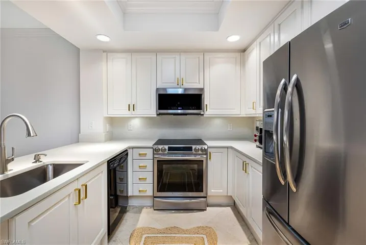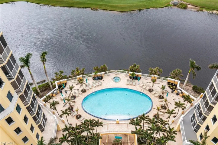 Set high above the treetops, this impressive 2nd-floor condo showcases sweeping lake and golf course panoramas and includes a PRIVATE COURTYARD available only on select 2nd-floor layouts, creating a rare outdoor retreat that sets this residence apart. An additional lanai on the east side of the building welcomes soft morning light and offers the perfect spot for coffee, reading, or easing into the day, while vibrant sunset skies over West Bay Club’s signature 9th hole bring stunning evenings at home. Inside, the expansive great-room design flows effortlessly into the open kitchen, making entertaining both easy and elegant. Each of the three spacious bedrooms features its own en-suite bath, and the large laundry room adds excellent storage and everyday convenience. The home is thoughtfully upgraded with Quartz counters, new carpet in the primary suite, upgraded light fixtures and fans, electric sunshades throughout, new memory foam mattresses, roll-down hurricane shutters, all new furniture, luxurious window treatments, crown molding, marble and travertine flooring—including travertine in a guest bedroom—and custom closets, along with private elevator access directly to the residence. Offered TURNKEY FURNISHED, it is move-in ready for effortless seasonal or full-time enjoyment. Jasmine Bay residents enjoy an infinity-edge pool, hot tub, private cabanas, grilling stations, club room, card room, movie theater, and a fully equipped fitness center, plus four on-site guest suites ideal for hosting visitors. West Bay Club further elevates the lifestyle with its beautifully remodeled 2024 Gulf-front Beach Club featuring full-service dining, towel and chair service, and direct beach access. Additional amenities include the Bay House with resort-style pool and Aqua Café for indoor or poolside dining, plus yoga, Pilates, spinning rooms, sauna, Technogym fitness center, and 8 Har-Tru tennis courts. River Park provides a kayak and boat launch with direct Gulf access, fishing pier, playground, basketball court, picnic areas, and a serene 1.5-mile nature trail, while the Sports Park offers 6 pickleball courts, bocce, a fitness lawn, and two dog parks. Optional membership is available for the private Pete and P.B. Dye championship golf course and clubhouse, and the community’s ideal location places you minutes from Coconut Point, Miromar Outlets, Hertz Arena, and SWFL International Airport.