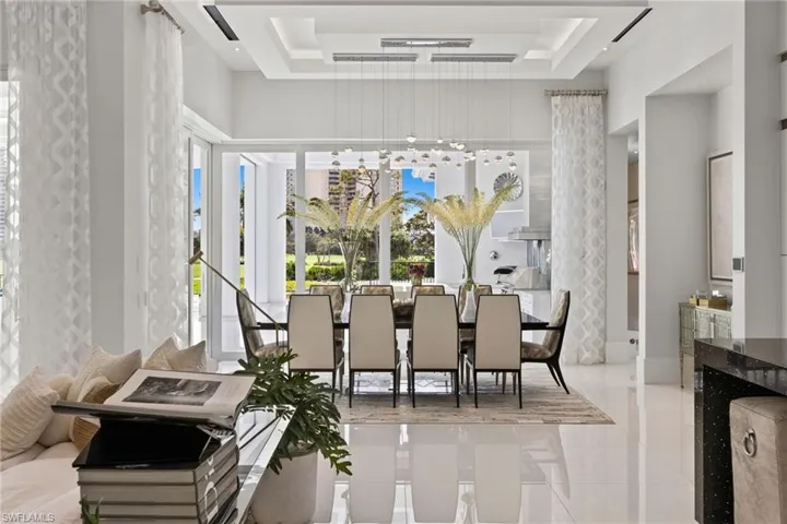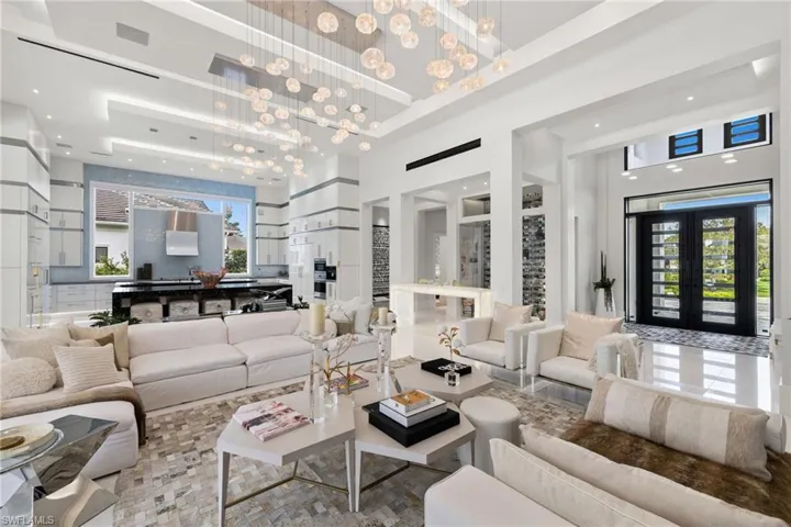 Luxury and sophistication are combined with world-class craftsmanship to deliver this award-winning STOCK custom home in the exclusive Bay Woods at Bonita Bay. Thoughtfully designed by New Architectura in collaboration with Wilfredo Emanuel Designs and Clive Daniel, this Cosmopolitan Chic home was the winner of the prestigious Sand Dollar Award and boasts a nearly $1,000,000 interior design package. Situated on a premium lot with unobstructed lake and golf course views, this home boasts 4 bedrooms, 6 bathrooms, bonus room, and an oversized 4-car garage with room for 5 plus cars. As you enter through the grand contemporary steel doors, you are immediately struck by the dramatic geometric ceiling details, white glass tile flooring, suspended lighting, illuminated quartz wine bar and glass-enclosed wine room. The Cosmopolitan theme is carried into the kitchen, featuring glass-faced cabinetry, quartz and semi-precious stone islands with waterfall, Wolf and SubZero built-in paneled appliances, Miele coffee machine, a walk-in pantry and more. The massive primary suite is nothing short of breathtaking. From its white oak flooring to the oversized seating area, dual walk-in closets, mirrored wall panels, textured wallpaper and built-in headboard with custom lighting. As you enter the primary bathroom, you will find two separate water closets, a free-standing tub, oversized shower with multiple heads, gorgeous tile and textured accent walls. Boasting more than 3,000SF of space, the outdoor area is a true focal point of the home and features countless upgrades such as electric shutters and screens, bug mist system, gas fireplace and separate fire pit area, massive outdoor kitchen with waterfall quartz counters, geometric ceiling details, white marble pavers, and pool bathroom. Enjoy the sunset views over the infinity edge gas-heated pool and spa. Continuing throughout the home, you will find that every guest bedroom is ensuite and features white oak flooring, walk-in custom closets and each has its own unique design cues such as custom draperies, wallpapers, ceiling and wall details. Showcased by a floor-to-ceiling glass entry, the opulent billiards/bonus room is sure to impress with its custom leather-padded wall and illuminated stone accents. The full-home Control4 smart system provides automated electric blinds throughout, smart lighting switches, indoor and outdoor built-in speakers, security system and more. Bonita Bay offers an array of outstanding amenities and optional memberships, from a private beach club to a full-service marina and multiple dining options. Experience premier golfing with five recently renovated Arthur Hills and Tom Fazio championship courses and three expansive practice facilities. Enjoy miles of scenic walking and biking trails, kayaking, canoeing, boat launch, state-of-the-art fitness center, an 18-court tennis and pickleball complex, numerous community parks and more.