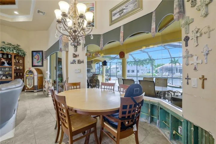 LOCATION, LOCATION, LOCATION! Situated on one of the most desirable streets in SW Cape Coral, this DIRECT GULF ACCESS home sits along the intersecting 142’ Blueberry canal and is surrounded by upscale residences and multi-million dollar homes. The existing open floorplan features high tray ceilings, a custom bar, den with glass french doors, and custom kitchen with solid wood cabinetry and granite counters. The split bedroom layout features two owner’s suites each with lanai access. The secondary suite bath also functions as the pool bath. Spacious screened lanai with plenty of room under truss for dining and lounging poolside, including a summer kitchen with seating perfect for entertaining. Only a short walk to the coveted Cape Harbour Promenade and Marina for dining, shopping and nightly entertainment. If you are a boater looking for the perfect location with excellent access to the Gulf of Mexico, and don’t want to wait to build new—this is the home for you! This home sustained water intrusion from hurricane Ian and is being SOLD AS IS with right to inspect. There is an open insurance claim on the roof. Drywall and flooring have been removed in areas of the home. Dock is damaged but lift is still operational.