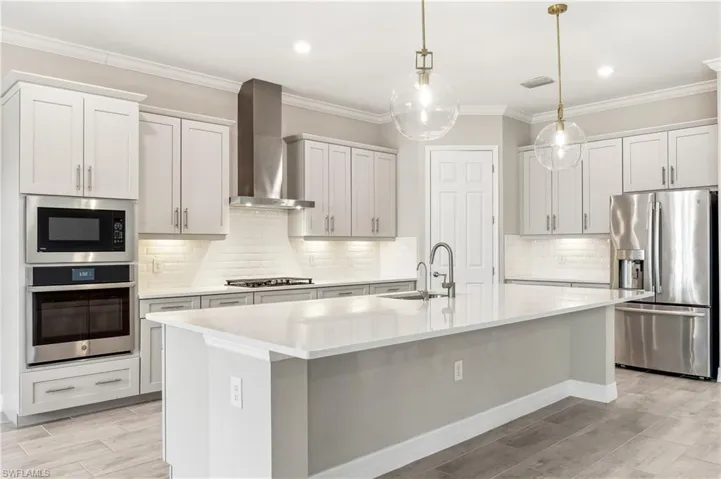 The expansive island kitchen is a chef’s dream, showcasing soft gray shaker-style cabinetry, stainless steel appliances, a gas cooktop, and elegant quartz countertops with a custom backsplash. It flows effortlessly into the dining area, family room, and the inviting outdoor living space.